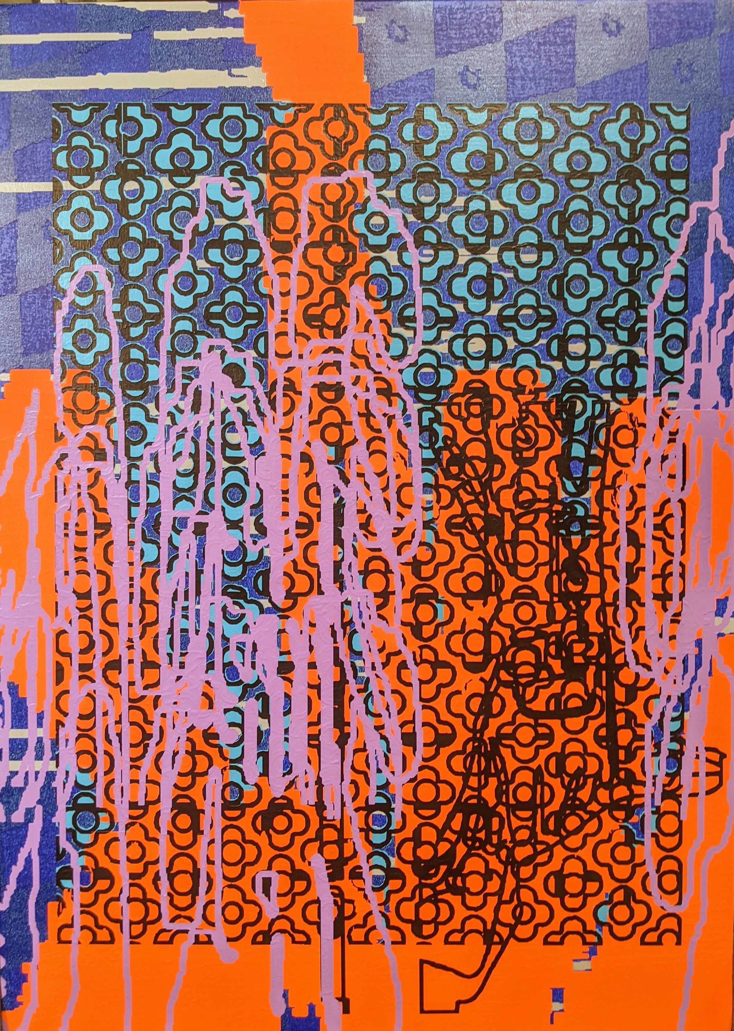 Casual system repeats a four-petalled flower grid. Designed in a graphic computer program, the pained work captures the translation "between computer programs...by Heilbron’s hand, the grids stretch and warp, frayed by pixelation and slippage."