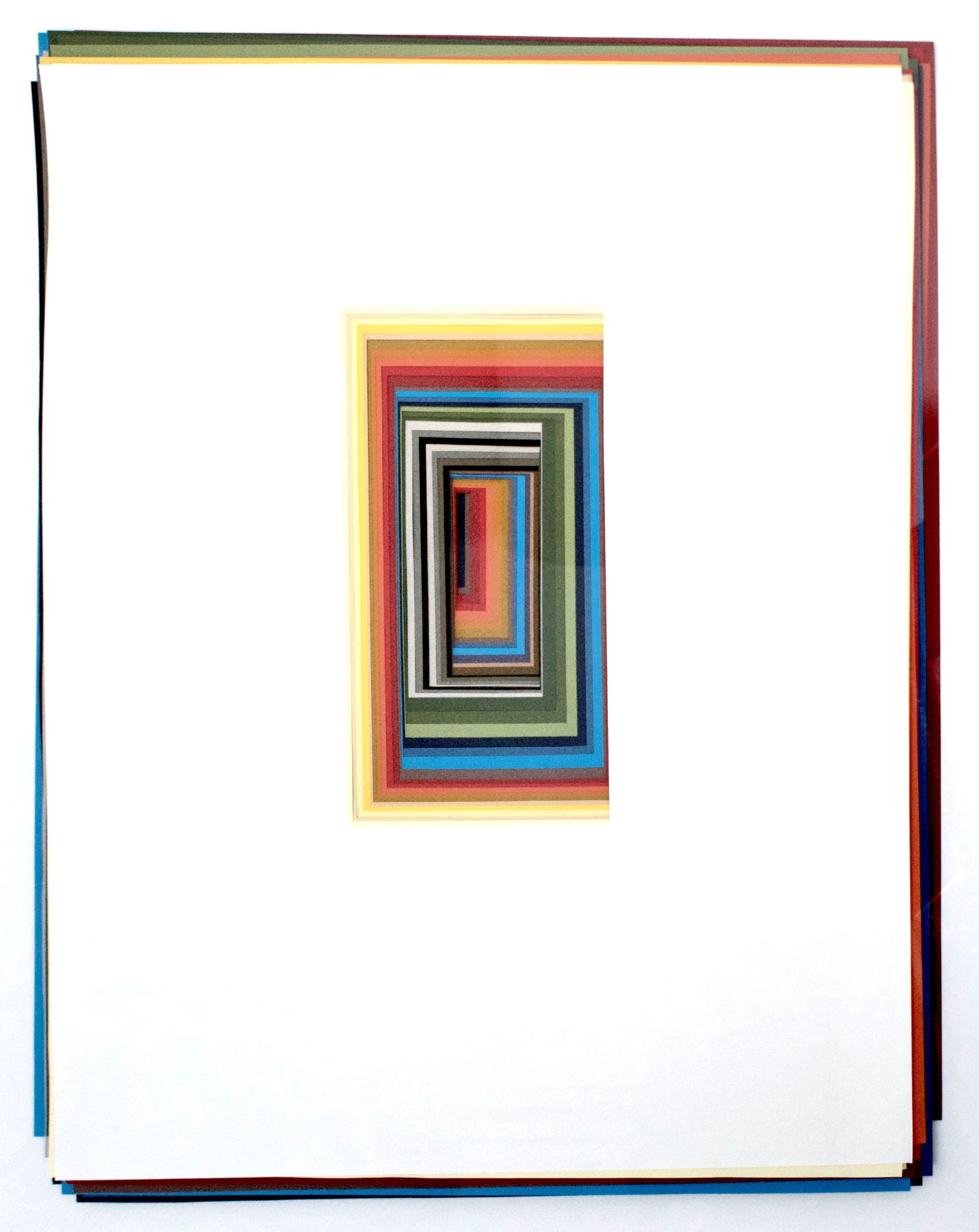 In Mass (2008), Brown uses an exacto knife to cut concentric rectangles into a stack of coloured Canson paper, creating the appearance of a flat surface with infinite depth and mass.
