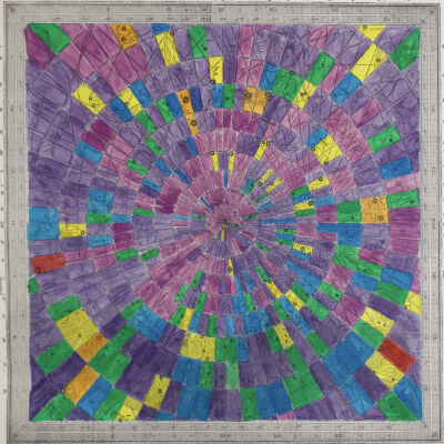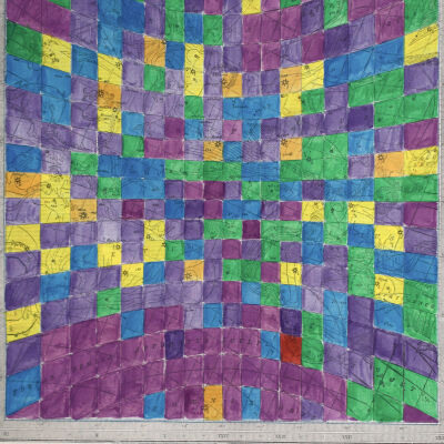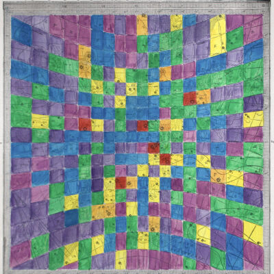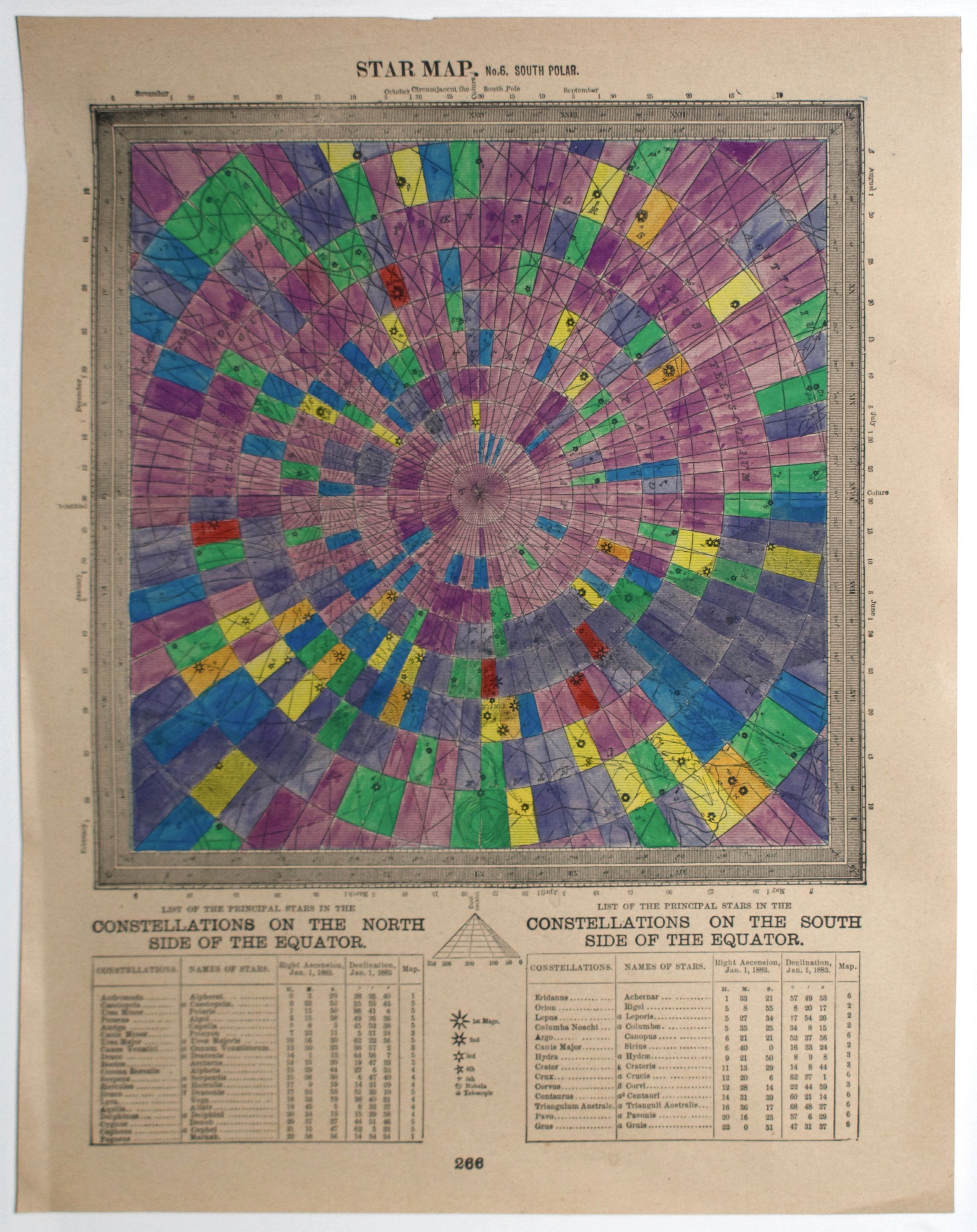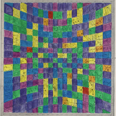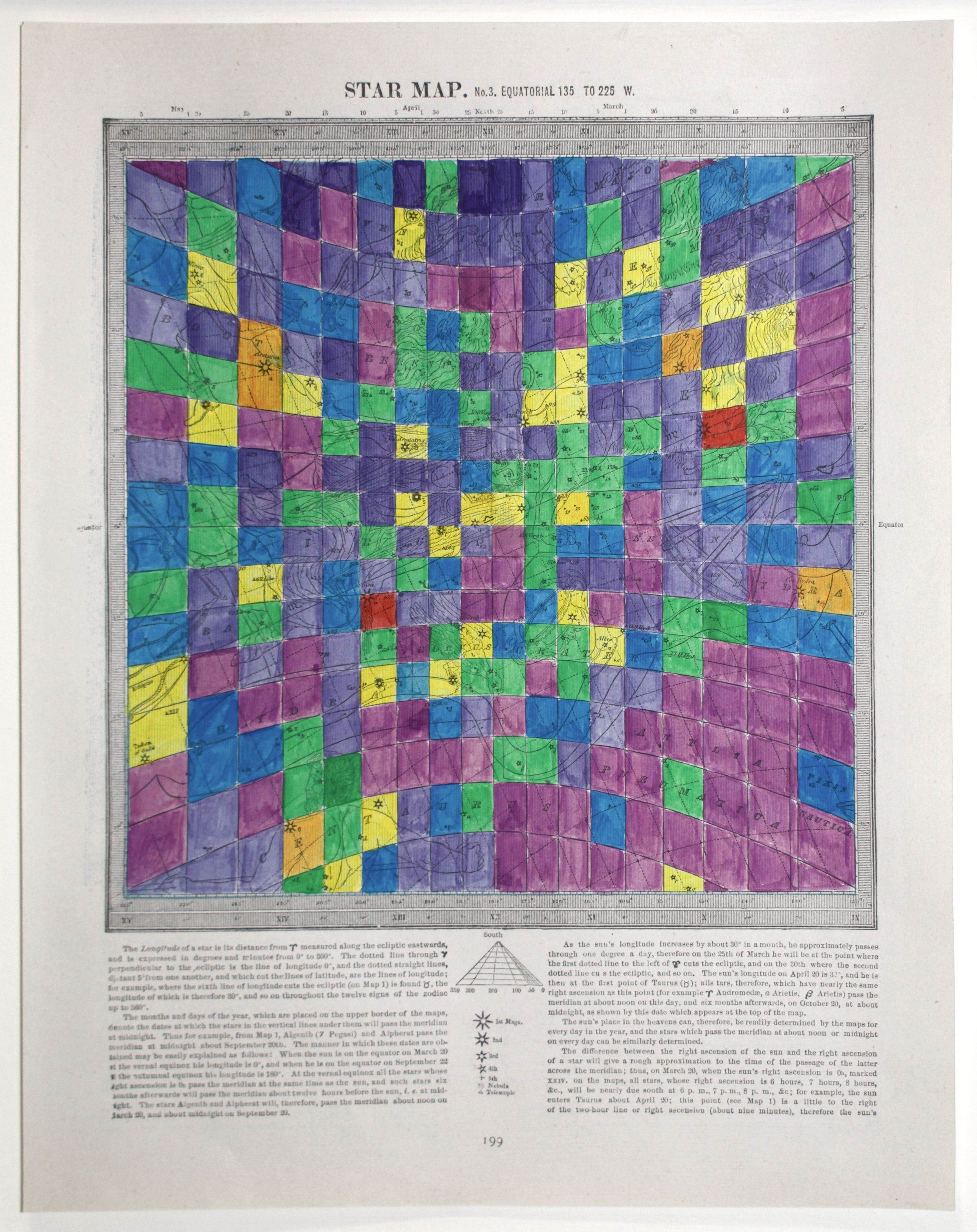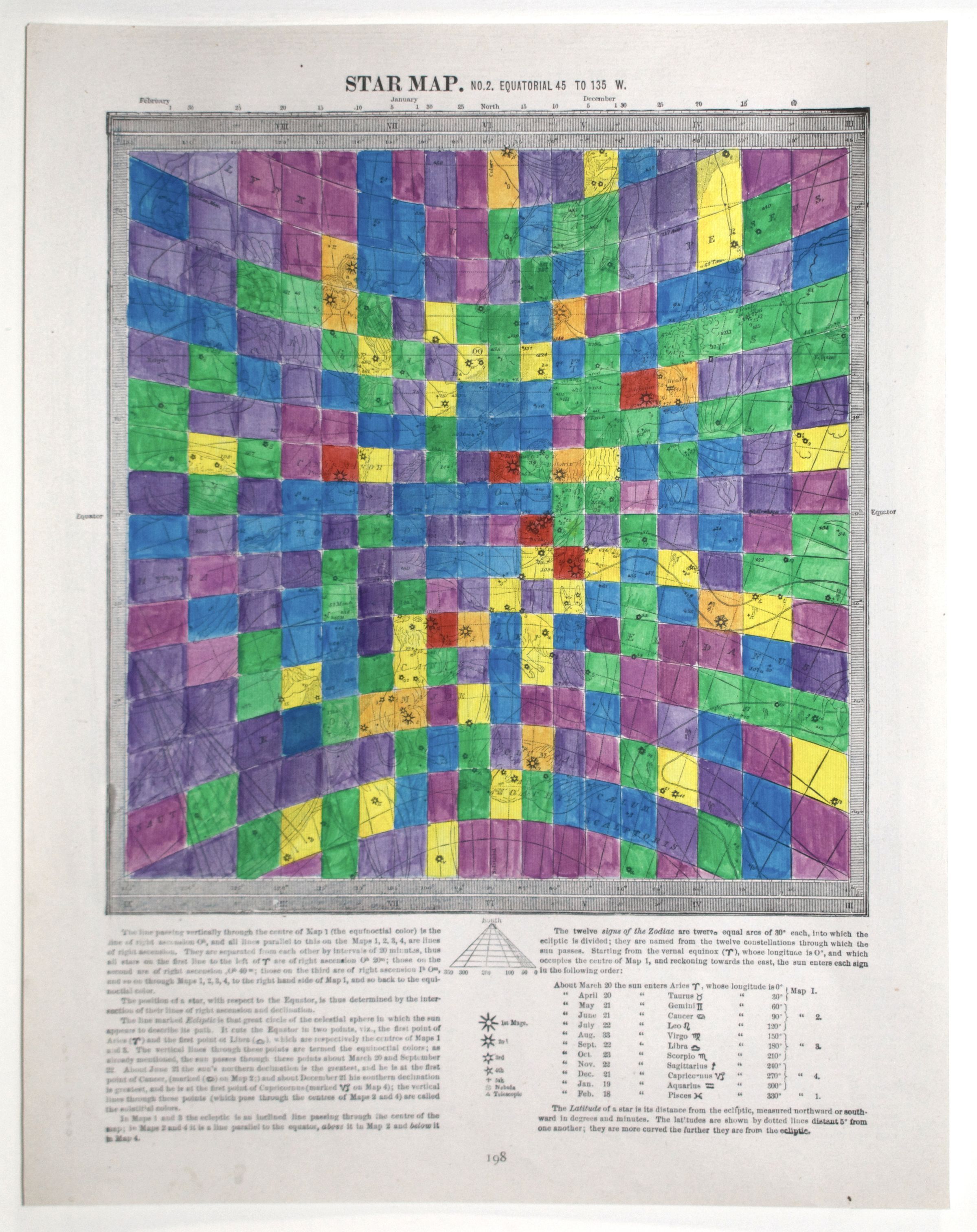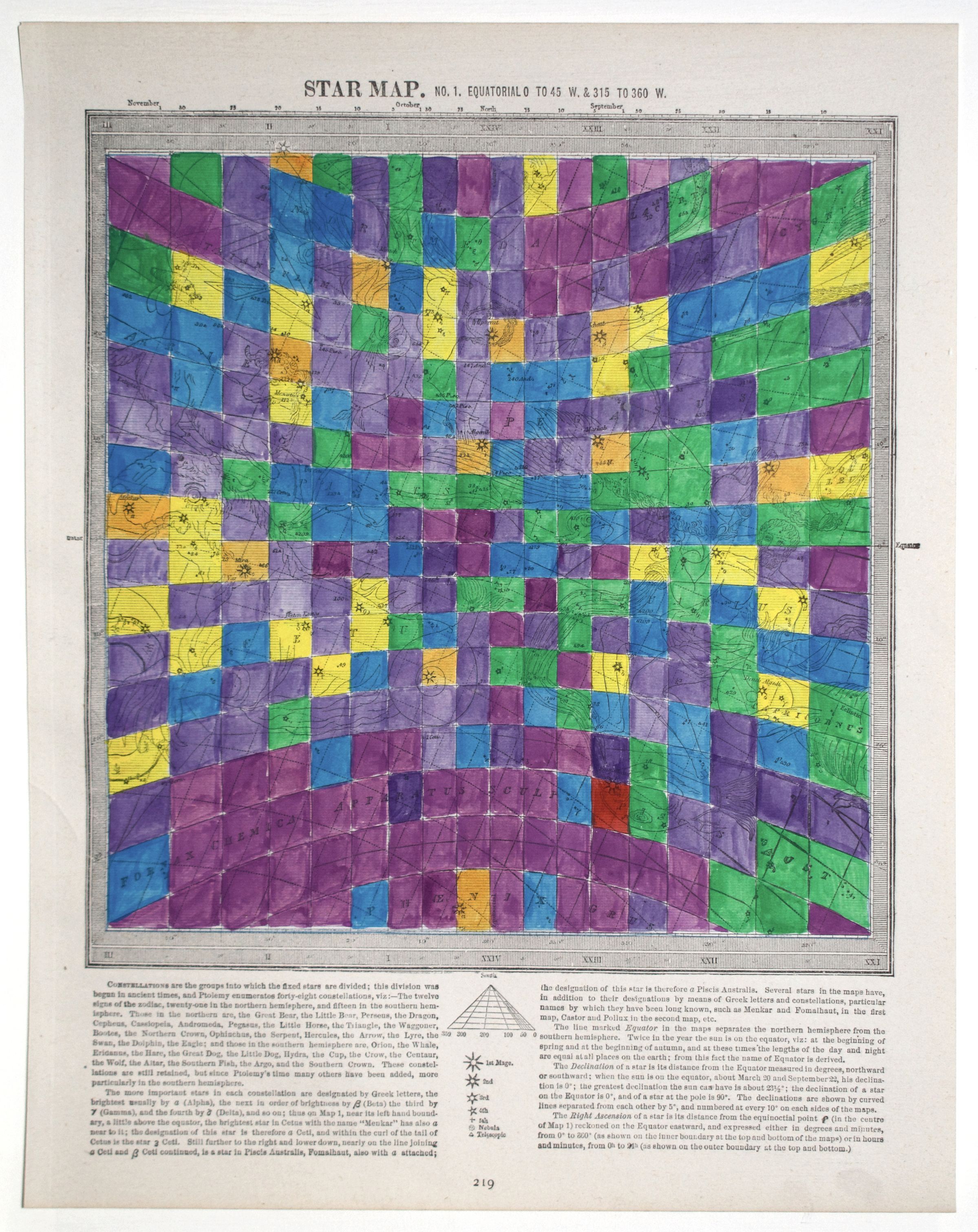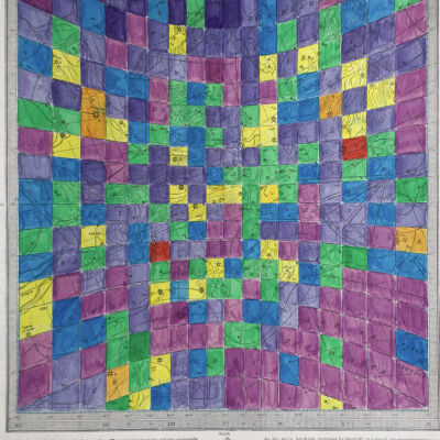 Star Values (2014) is a series of hand-coloured prints taken from an astrology atlas from the 1890s. Depicted in each are stars and constellations overlaid with the corresponding longitudinal and latitudinal lines printed by the artist. Robertson colours each section of the grid based on a value such as the brightness of a star or the number of stars in one. The choice of colours follows Sir Issac Newton’s hierarchy of colours in which warm colours like red, then orange and yellow denote a higher importance or value than cooler colours like green, blue or violet. Robertson uses the same image six times with different criteria to highlight how information and ideas can be interpreted to suit a goal. Like the practice of writing history, his works parallel the variety of information that can be established from a single source.