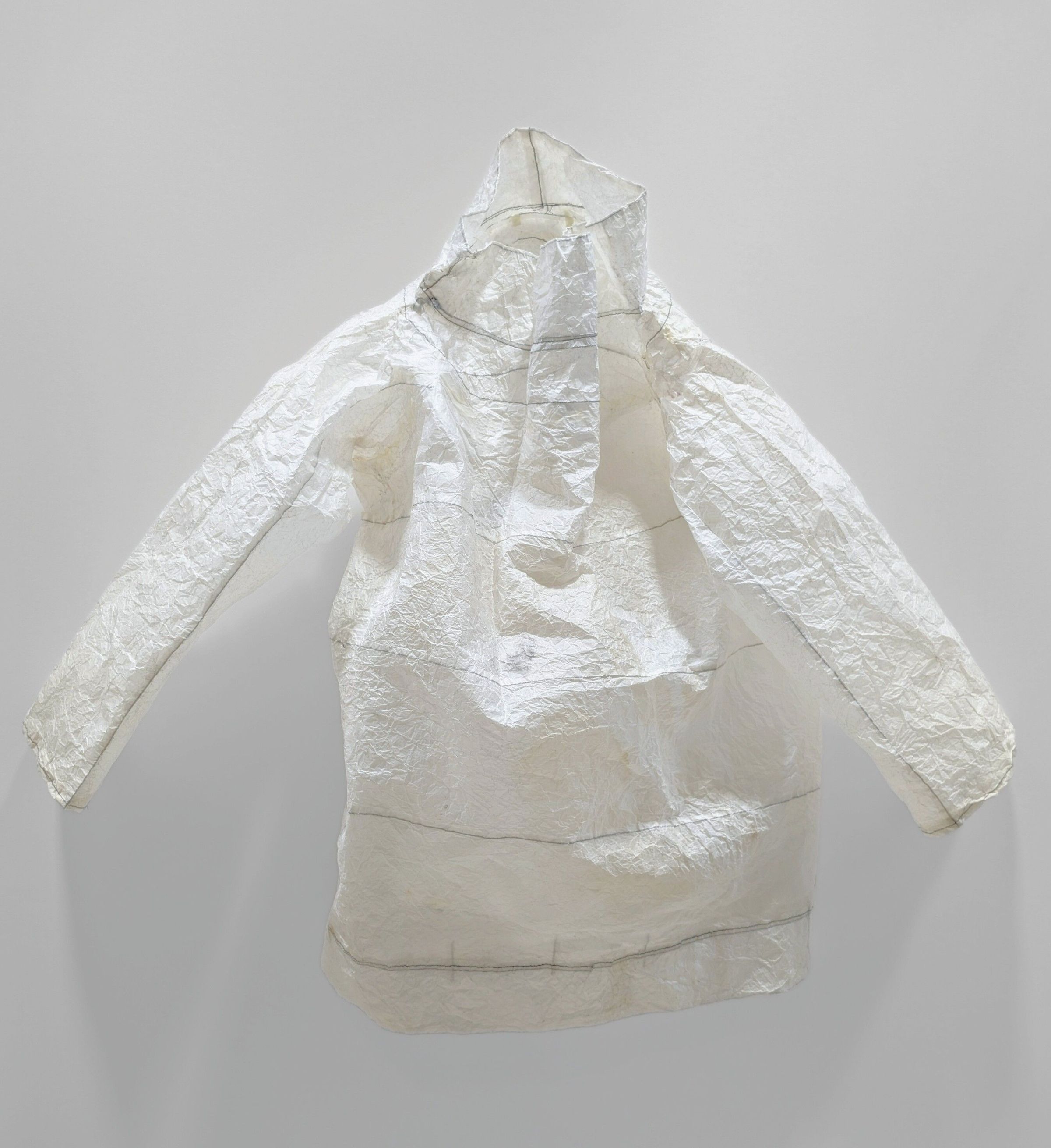 Gut Jackets are a series of glassine paper and wire sculptures made to replicate traditional Inuit anorak made of whale or seal intestines and sinew. Magor’s use of material brings out an inherent irony between form, function, and meaning. Unlike the original garments, the artist’s creations are not waterproof or warm. They are not comfortable or protective. Instead, they are fragile and unable to be worn. The Gut Jackets resemble the form of the highly practical anorak but unlike their name, they are neither made of guts nor are they jackets. To the Inuit, clothing plays a significant role in keeping Inuit cultural values and knowledge alive. It both sustains and expresses Inuit identity. Magor's fakes highlight the complex bodily relationship between Inuit culture and anorak by reducing it to an unusable aesthetic which is seen and not worn.