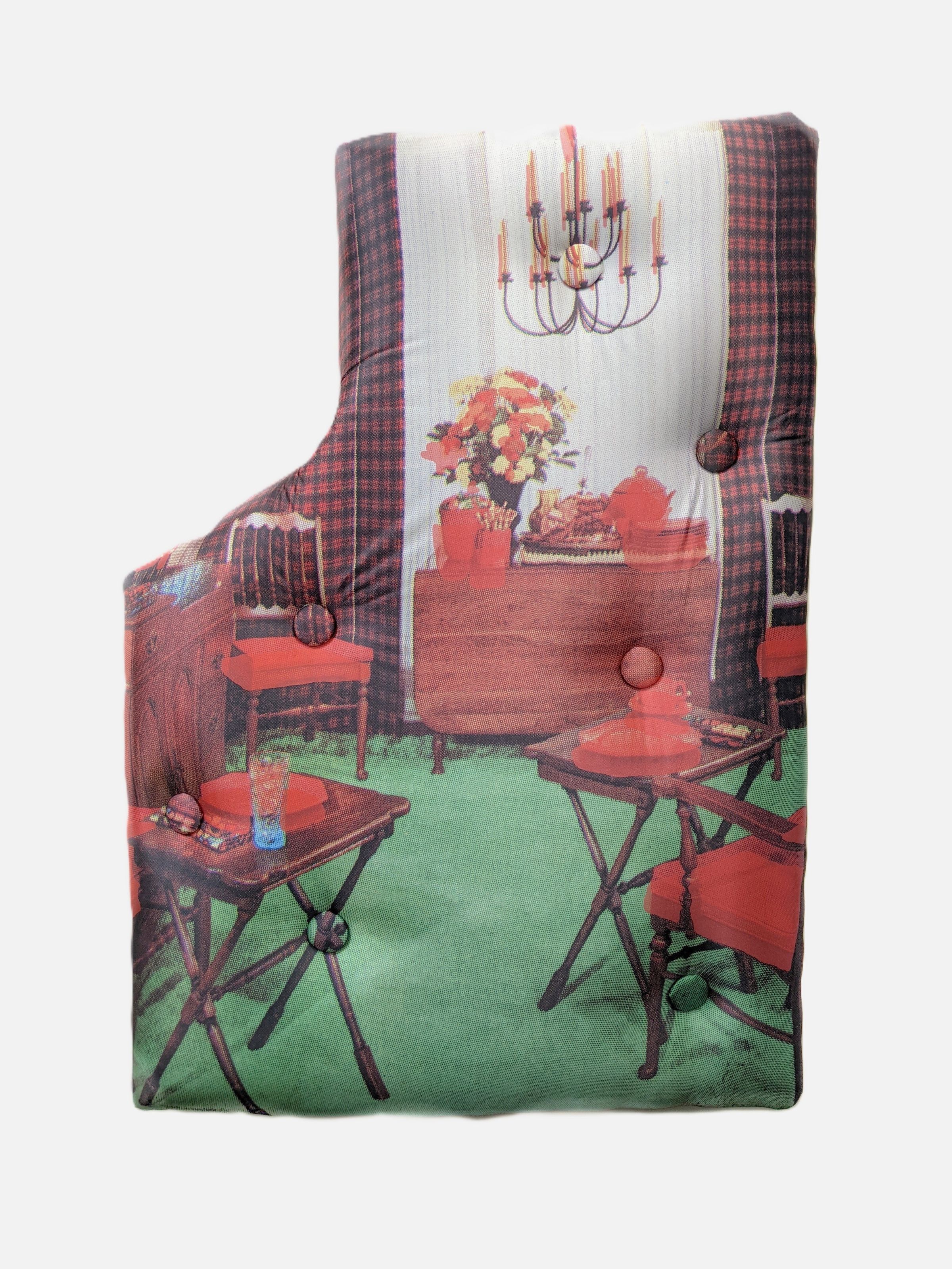 The artist's series of upholstered cushion depict vividly coloured house interiors from the 1950s. The three-dimensional works use the physical medium to evoke a sensory and bodily experience. The tufted cushion surface brings forth a sense of nostalgia as the viewer experiences both the physical form and visual images of a previous era. Huston-Herterich plays on the history of interior design and the various ways decoration and furniture have been used to shape our emotional state and experiences within a space.