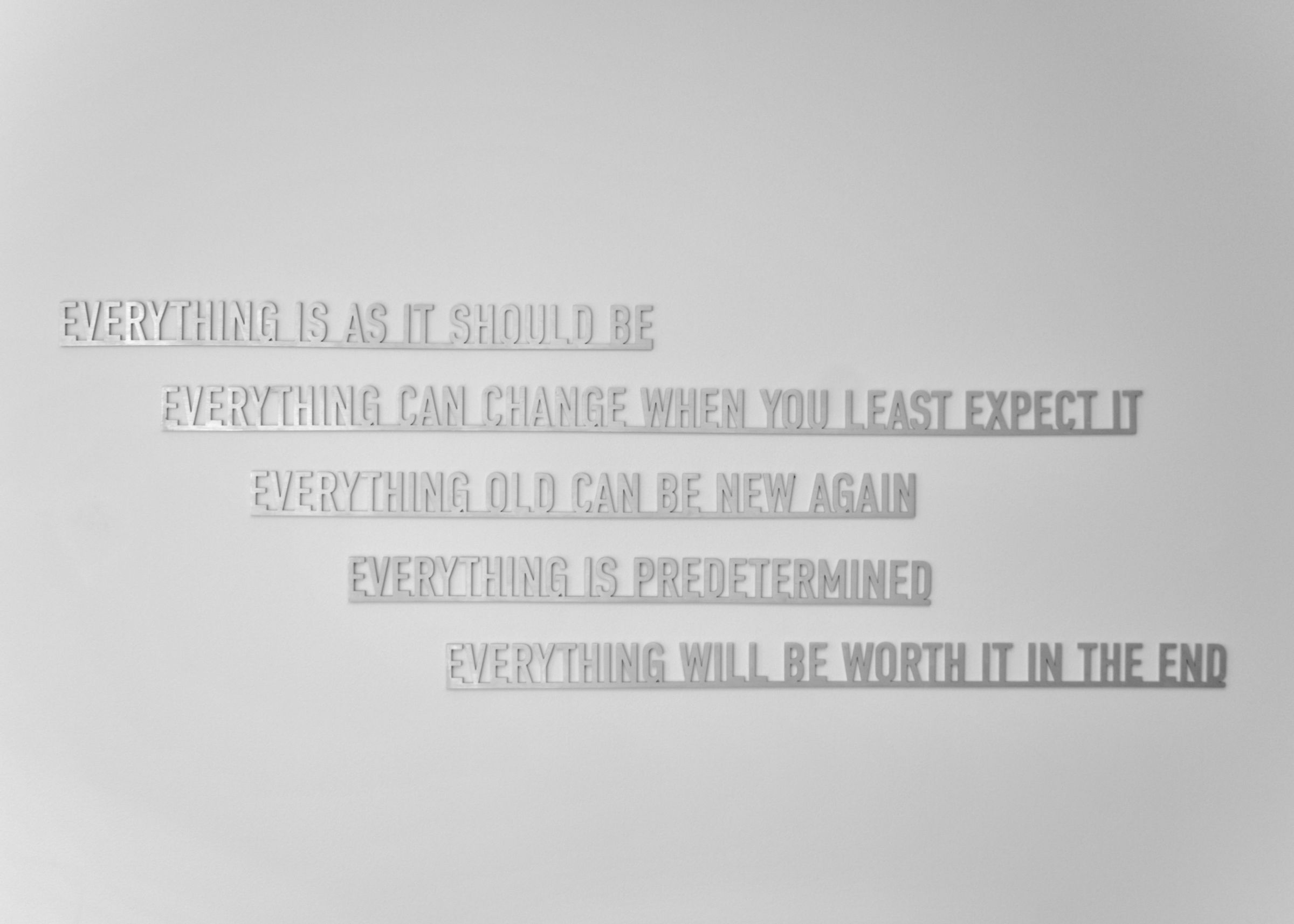 Many of her works take the form of odd motivational phrases made out of neon lights, LEDs, cut metal, and other materials. The artist plays with the self-help format using humour and sarcasm to point out the glib nature of the mantras often found in motivational posters. Sometimes, Mark’s phrases appear borrowed ironically while others are obvious parodies by the artist—NOTHING IS SO IMPORTANT THAT IT NEEDS TO BE MADE IN SIX FOOT NEON. These works also speak towards a recurring theme of reputation and routine. To Mark, there is comfort in routine. Daily rituals are an innate and fundamental part of life that shape our interaction and identity.