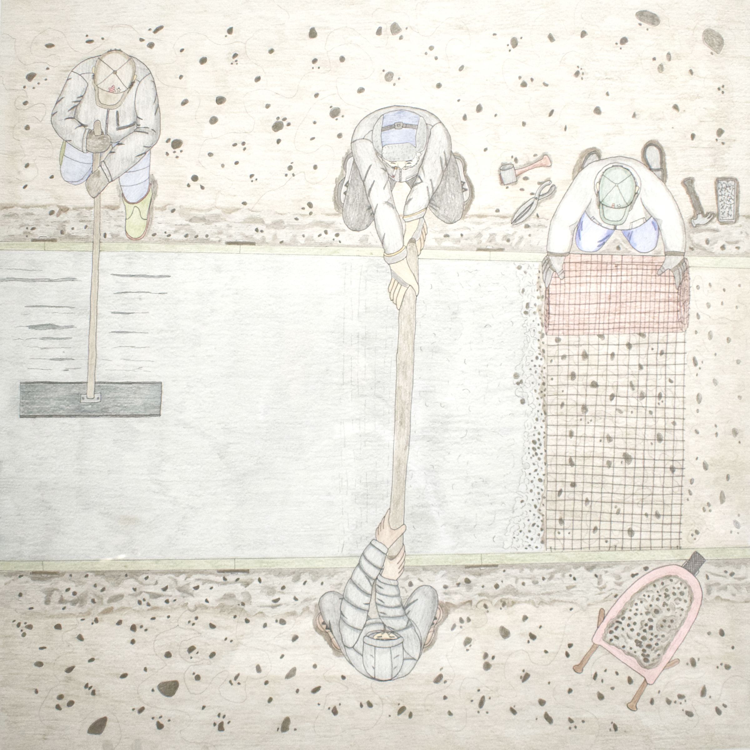Siassie Kenneally began her artistic career in 2004, working out of the renowned Kinngait Studios where she created prints and drawings in ink and coloured pencil. Her practice drew from traditional and contemporary Inuit material culture as well as from her own experiences as a child being taught lessons by her father about the relationships between humans, animals, and the land. Kenneally's subject matter is highly intimate and ranges from simple naturalistic landscapes that document the personal lives of her community to still-life drawings of objects that symbolize the complexity and changes in Inuit culture and her own life. The artist frequently plays with perspective in her compositions to emphasize the importance of physical objects, using offset aerial views and linear perspective at the same time to show the interior contents of buildings or the items around figures.