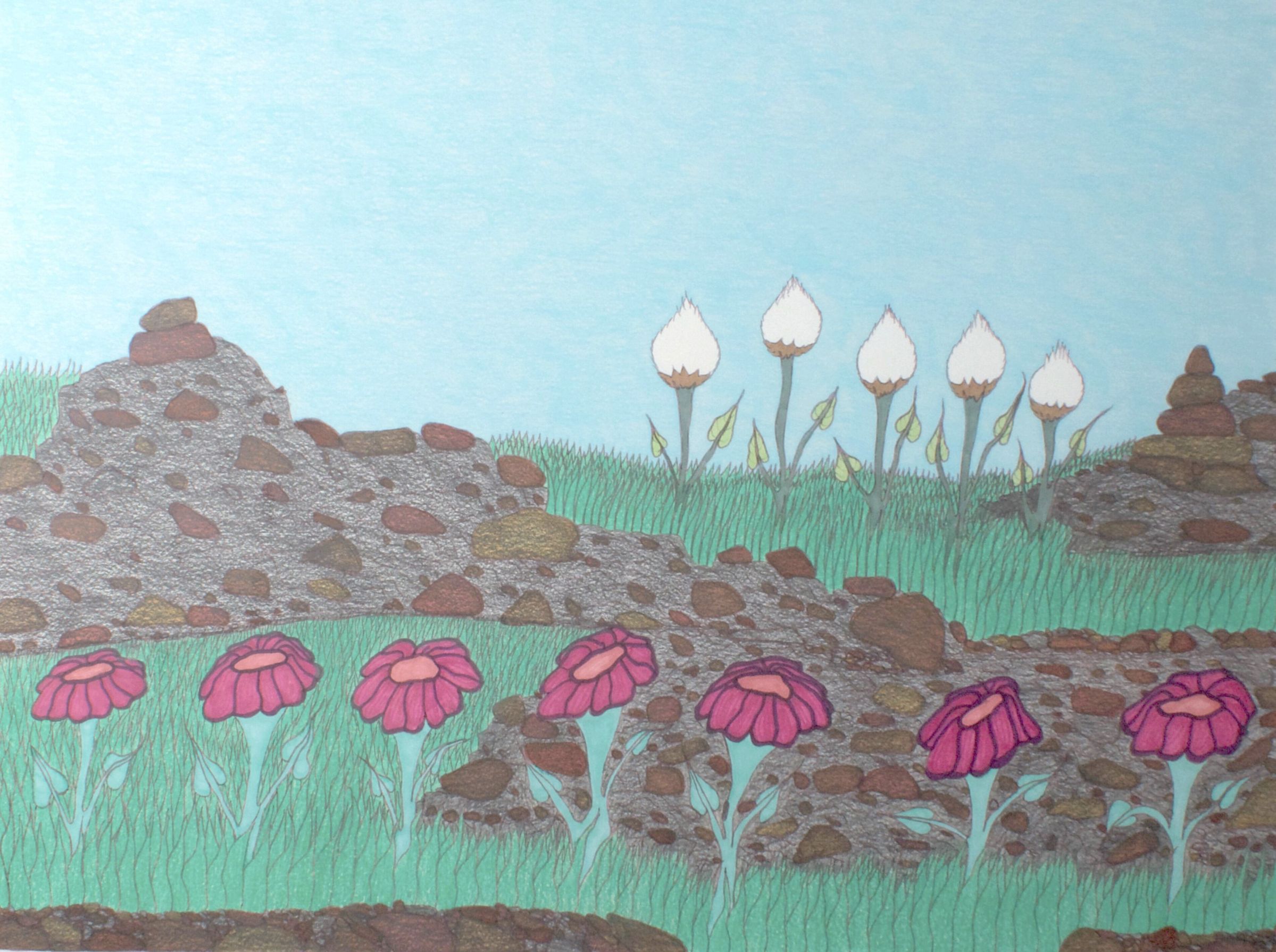 Nicotye Samayualie (b. 1983, Kinngait, Nunavut) is a Canadian based in Kinngait (Cape Dorset). Coming from a family of artists that include her grandmother Keeleemeeoomee Samayualie (1913- 1983) and cousin Annie Pootoogook (1969-2016), Samayualie specializes in drawings of expressive and colourful landscapes based on the surrounding wilderness of Northern Canada. She is equally fascinated by patterns, both natural and man-made. Many of her drawings depict the textures and organized arrangements of rocks or flowers as well as everyday items such as sewing materials or food on shelves. Her particular fascination with repetition and design presents a unique perspective on Inuit material culture and the artist's own identity. Samayualie's art highlights the interconnectedness between nature and humanity from the smallest cellular structures to the large rocks that form mountain landscapes.