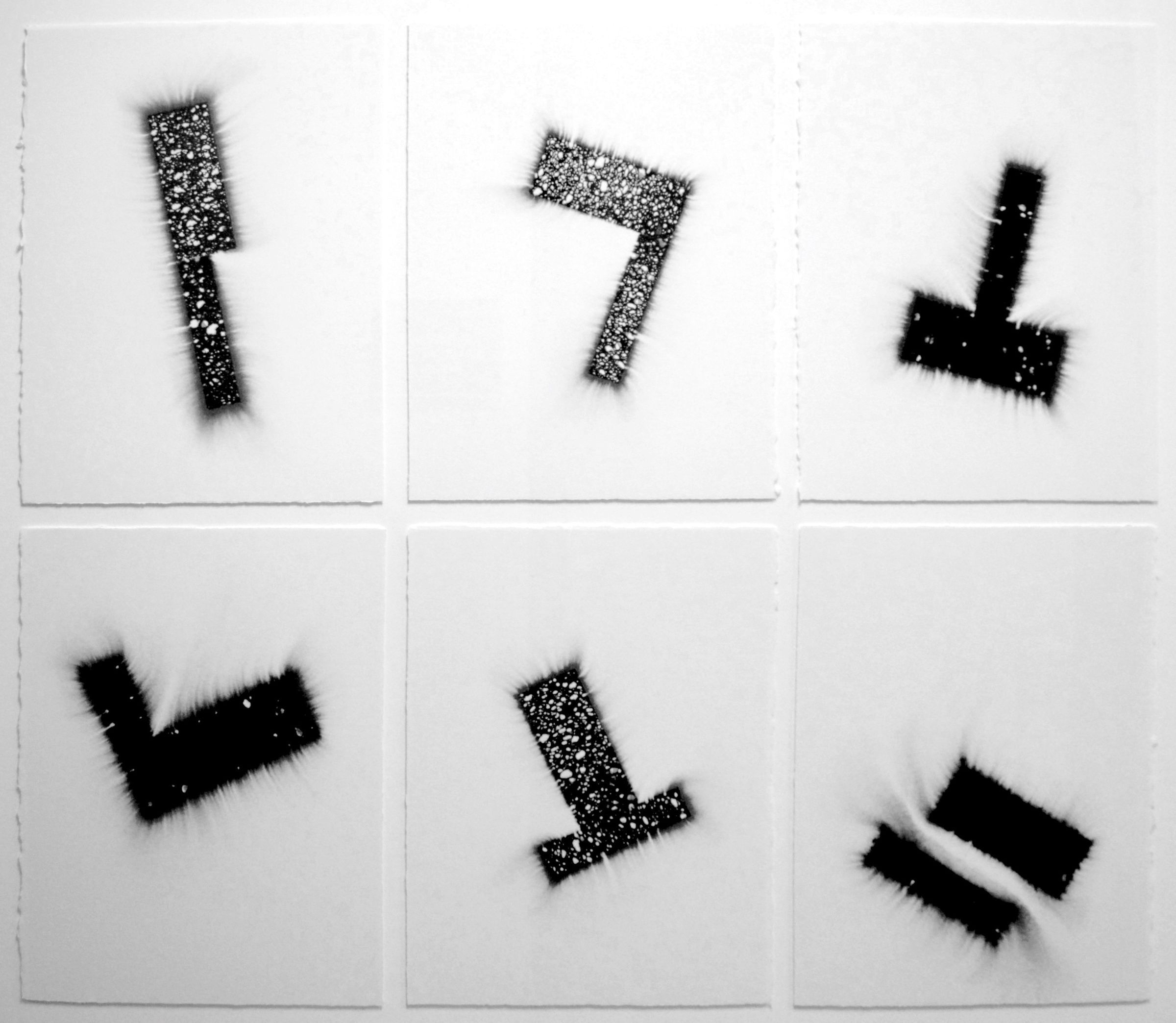 Géométrie variable (2015) is a group of works produced by imprinting sponges soaked in aqua dispersion onto paper. The resulting abstract images become a reference to the formal geometry of the sponge. The sponge serves as both medium and subject illustrating an interesting intersection where the subject is simultaneously absent and present.