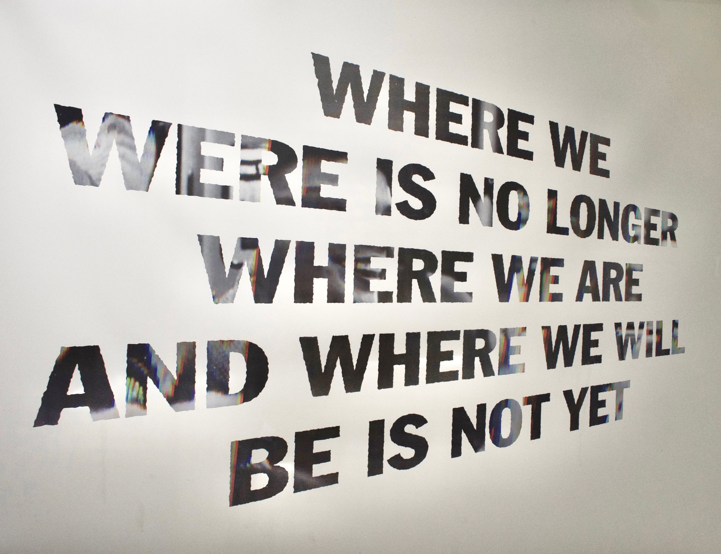 Silent Trans-Forming (2014) uses language to reference historical change and the passage of time . The phrase "WHERE WE WERE IS NO LONGER WHERE WE ARE AND WHERE WE WILL BE IS NOT YET" considers the ambiguity of the future and points toward the inevitable fact that this future will be different from the past.