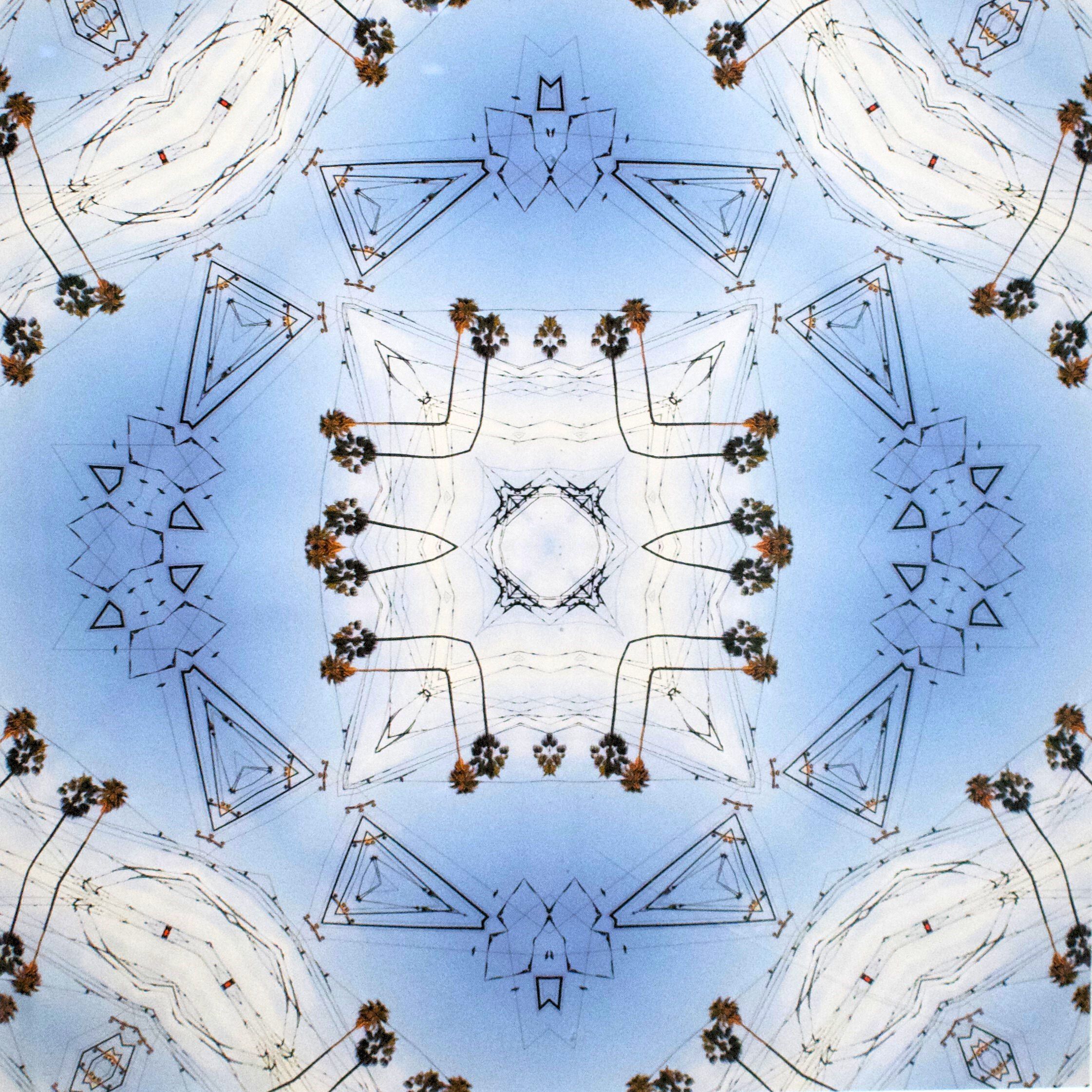 Forever in the Sky (2012) are a series of digitally manipulated photographs of the clouds over San Francisco. These images transform the sky into a symmetrical and vibrant kaleidoscope. Mazinani aims to focus on our mediated relationship to nature by using the subject of the sky as a symbol of freedom from the borders that exist below. The layered geometric symmetry of the artworks regulates the direction of the clouds keeping them forever in the sky above. This brings attention to our movement. which differs from the autonomy of nature which moves freely and without restraint.