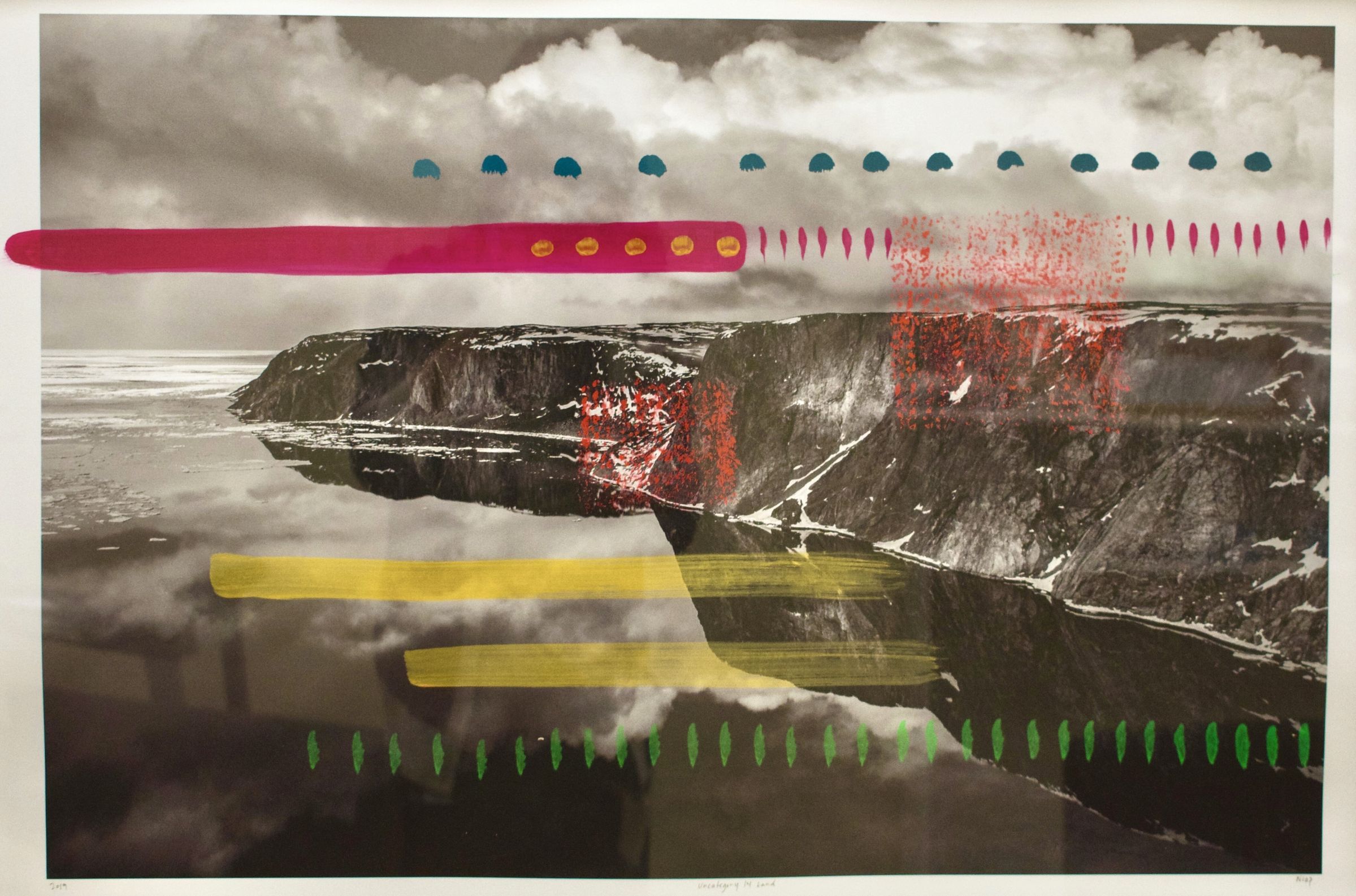 In Uncategory 14 Land (2019), Niap repurposes the black-and-white images of northern landscapes by documentary photographer Robert Fréchette. The artist paints over the somber and empty images with lines and markings reminiscent of Inuk tattoos that add colour, movement, and life to the scenery. In doing so, she asserts that there is more to static landscapes than beauty. Comparing her works to historic ethnographic and romantic photography, Niap overthrows the stereotypical imagery that erases the Inuit from the land and creates the assumption that Inuit culture exists in the past. Her work illustrates the current reclamation of traditional territories that were seen as "untouched" by colonial powers and the ongoing existence of a contemporary Inuit.