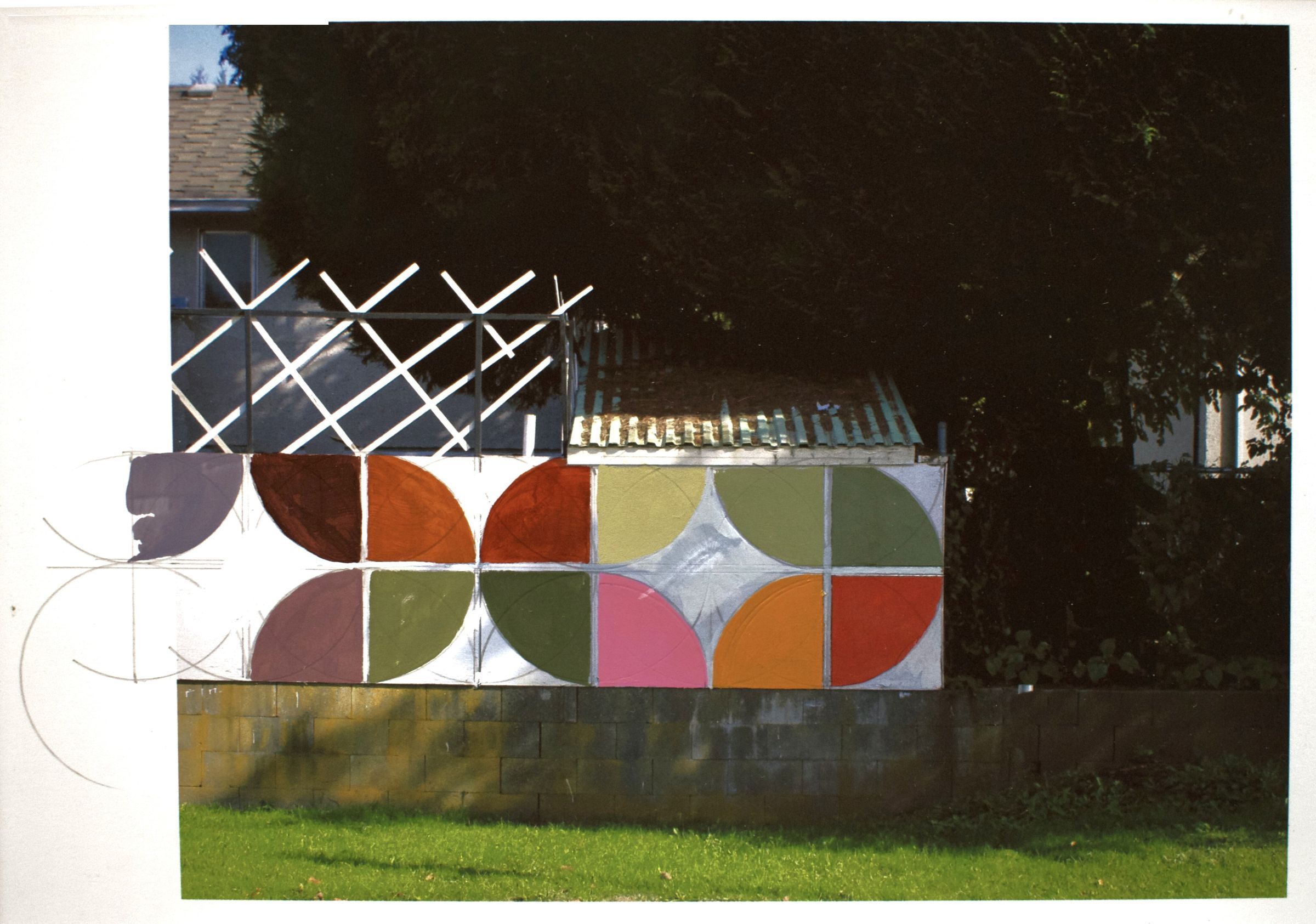 McSavaney observes his architectural subjects with the precision of a camera lens as he mimics the principles of photography in the medium of paint and ink. The angles, lighting, and mechanics of the architecture are studied, simplified and broken down into lines and intersecting planes in order to recreate it on the canvas. That said, the artist diverges from reality leaving his own mark on the painted version of the buildings. The flat white concrete walls of painted structures are ornamented with boldly coloured geometric patterns and lines. They are given a layer of depth as McSavaney repurposes and reshapes them into art.