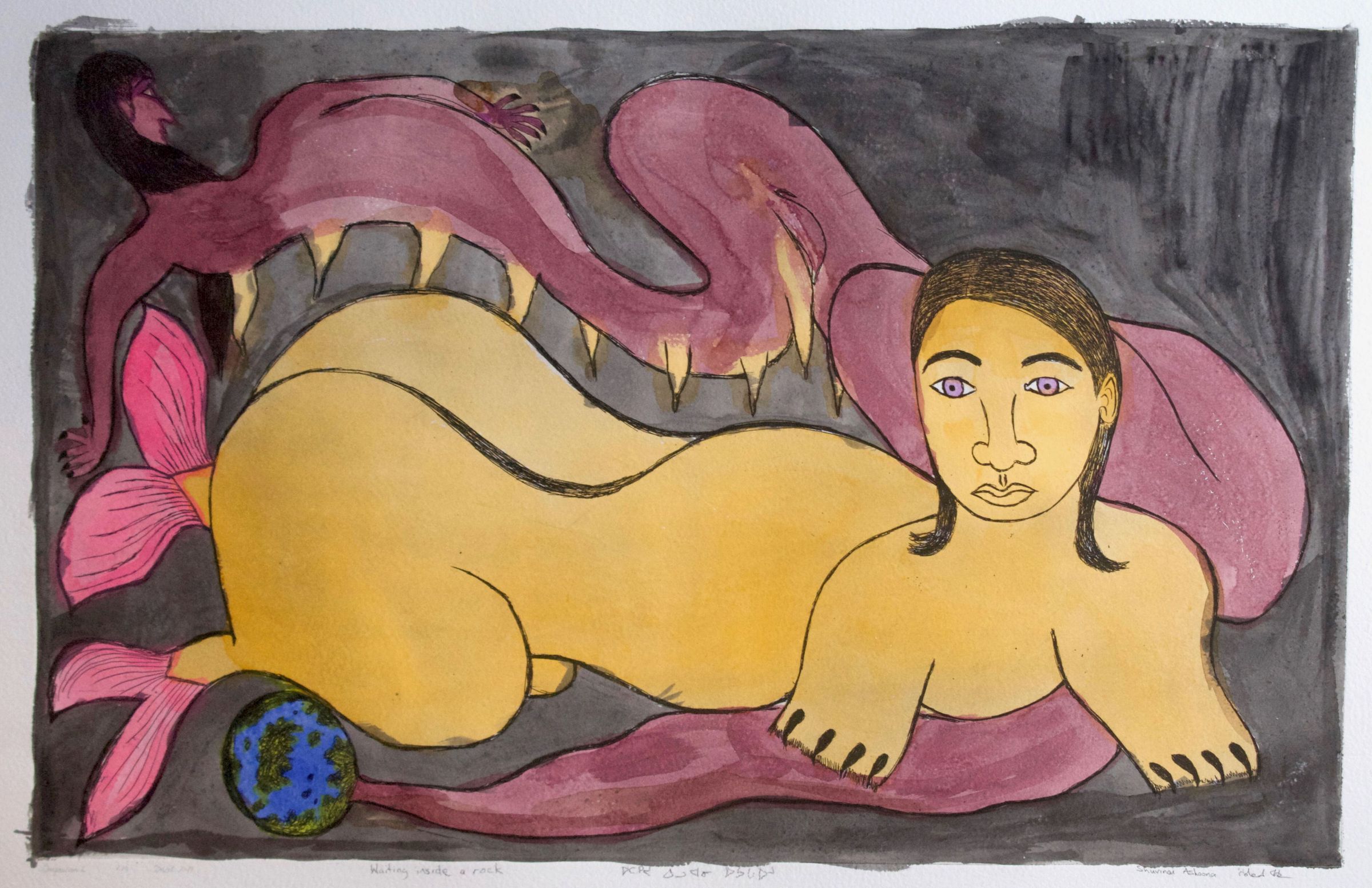 Working mainly in drawing and print, Ashoona is known for her playful and personal imagery and vibrant compositions that range from depicting daily life in Kinngait to visions of a future fighting other-worldly creatures. Her art navigates past and present relationships between nature and humanity as well as Inuk identity to convey diversity and changes in the community and landscape.Artwork Details
