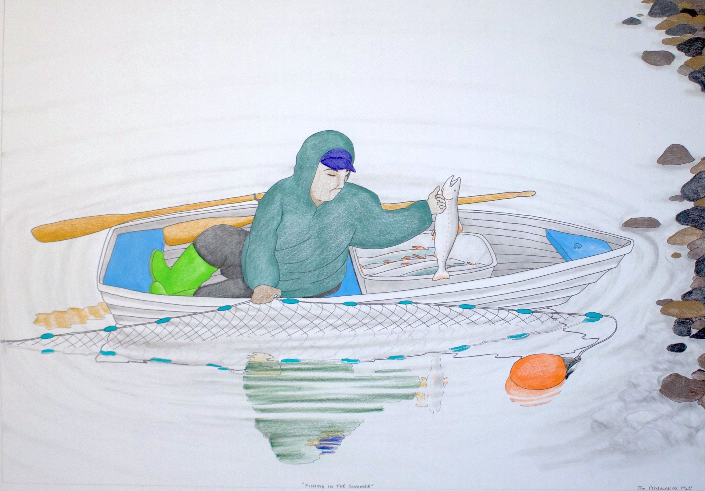 Being a modern Inuit hunter, Pitsiulak was moved by the land and the diverse wildlife within it. He was equally interested in the boats, ATVs, and heavy equipment that conveyed modern life in Cape Dorset. Detailed in his realistic drawings and prints is a world where traditions and modernity are blended and admired. Pitsiulak depicts figures in traditional anorak travelling the landscape on ATVs, men in rubber boots and ball caps fishing for food with nets, as well as Inuit carving seals and walruses with traditional tools. Through his honest and simple imagery, the artist captured his deep affection for his community, its traditions, and the land.Artwork Details