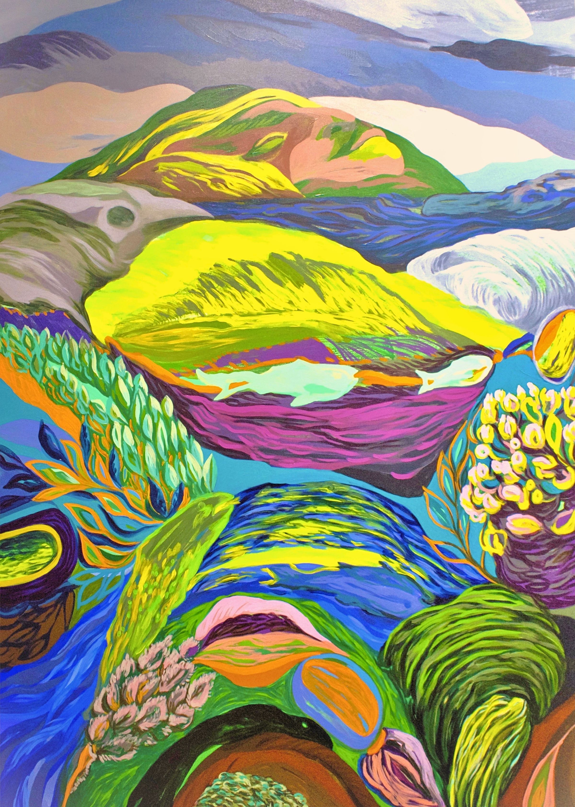 The Threads that Connect Us (2021) deviates radically from traditional imagery and depictions of the land. A large human-like mountain sits centre-back as waters, landscapes, and wildlife twist and swirls in the foreground. Although the abstracted imagery is unassuming, Vicker uses gestural and expressive brushstrokes and vibrant colours to fill the composition. In doing so, the artist portrays a landscape that is both alive and in motion, and whose parts are connected both physically and in spirit.