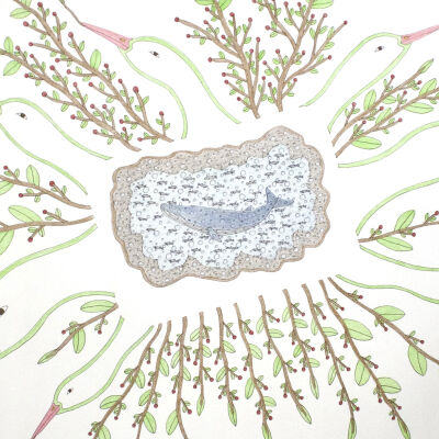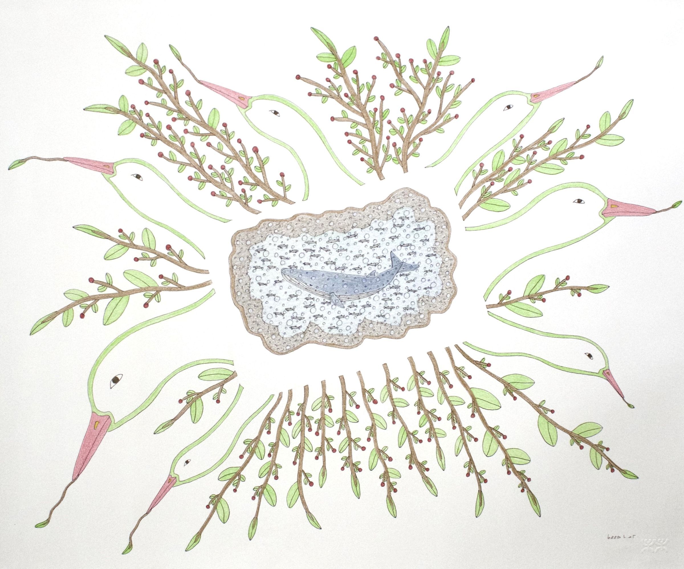 Manumie's artworks are detailed, colourful, and often humorous. His subject matter draws from reality but is influenced by the artist's rich imagination. It ranges from elaborate visual retellings of Inuit mythology to depictions of contemporary Inuit life and the realities of climate change on the landscape and wildlife. For example, Manumie has portrayed Inuit riding on giant moose or had birds playing with Pepsi logos like seeds. At other times, he has created still lives of animals with great attention. The diversity of his practices reflects the artist’s skill in documenting the world around him and conveying his perspective with his art.