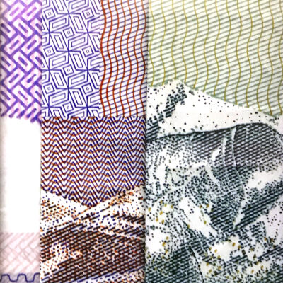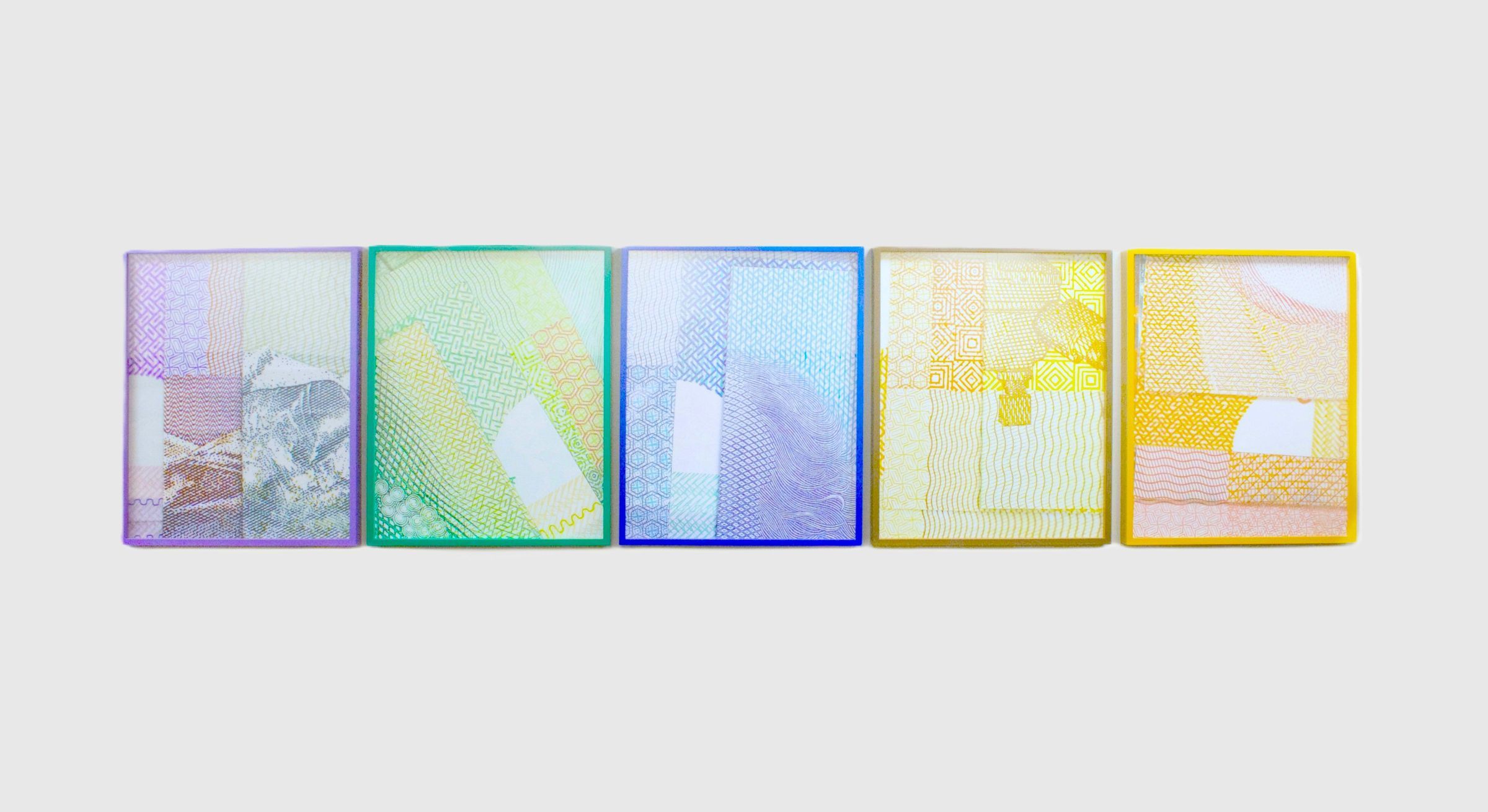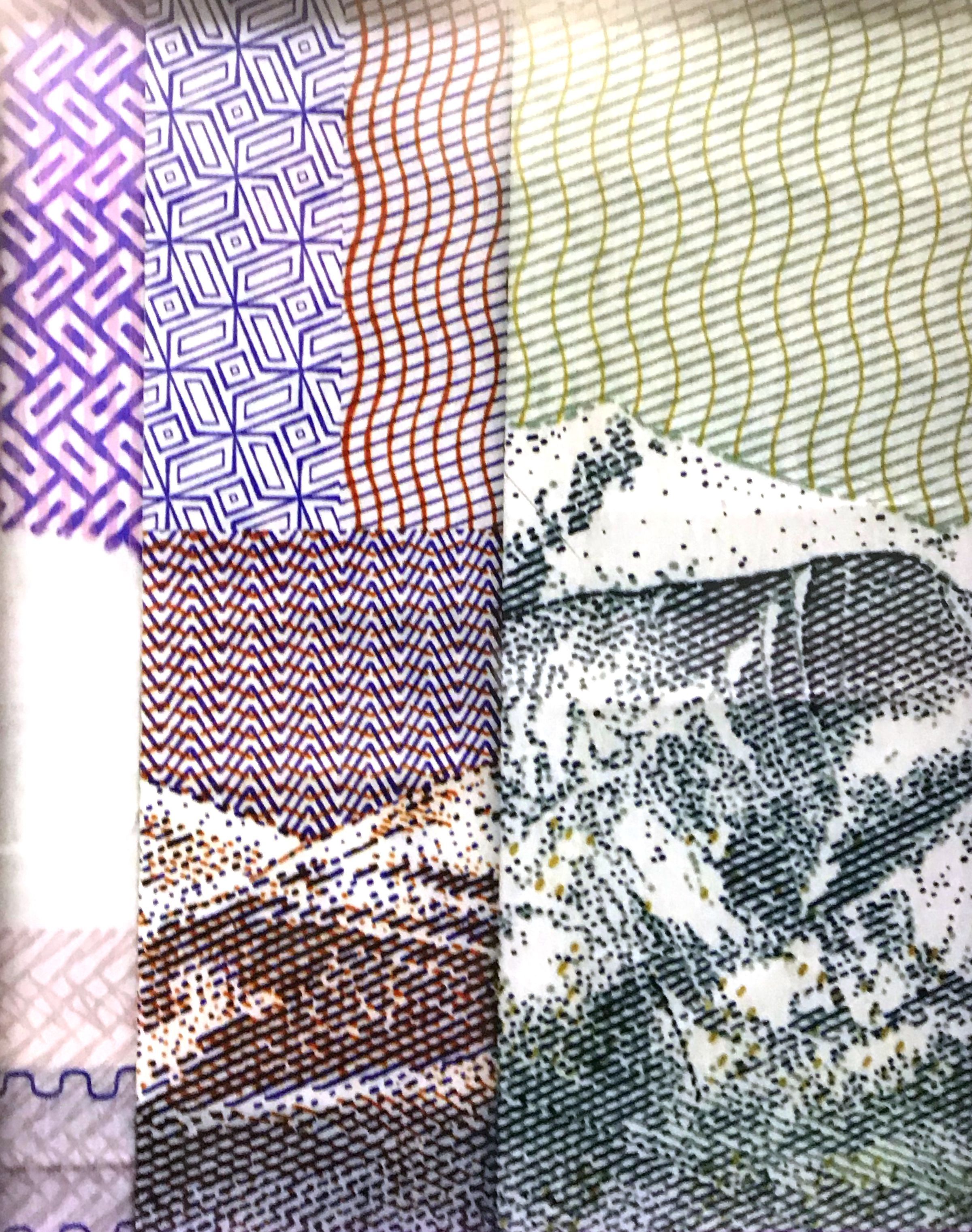 Jasper, Elizabeth, Wilfrid, Zeiss, William (2014) are digital prints of varying denominations of Canadian currency. The artist folded each bill and digitally enlarged it until the embedded security features were no longer perceptible to the technology and the familiar imagery felt foreign to the eye. The resulting images appear like Japanese origami paper or textile cloth as ornate textile-like patterns emerge from the layered folds.