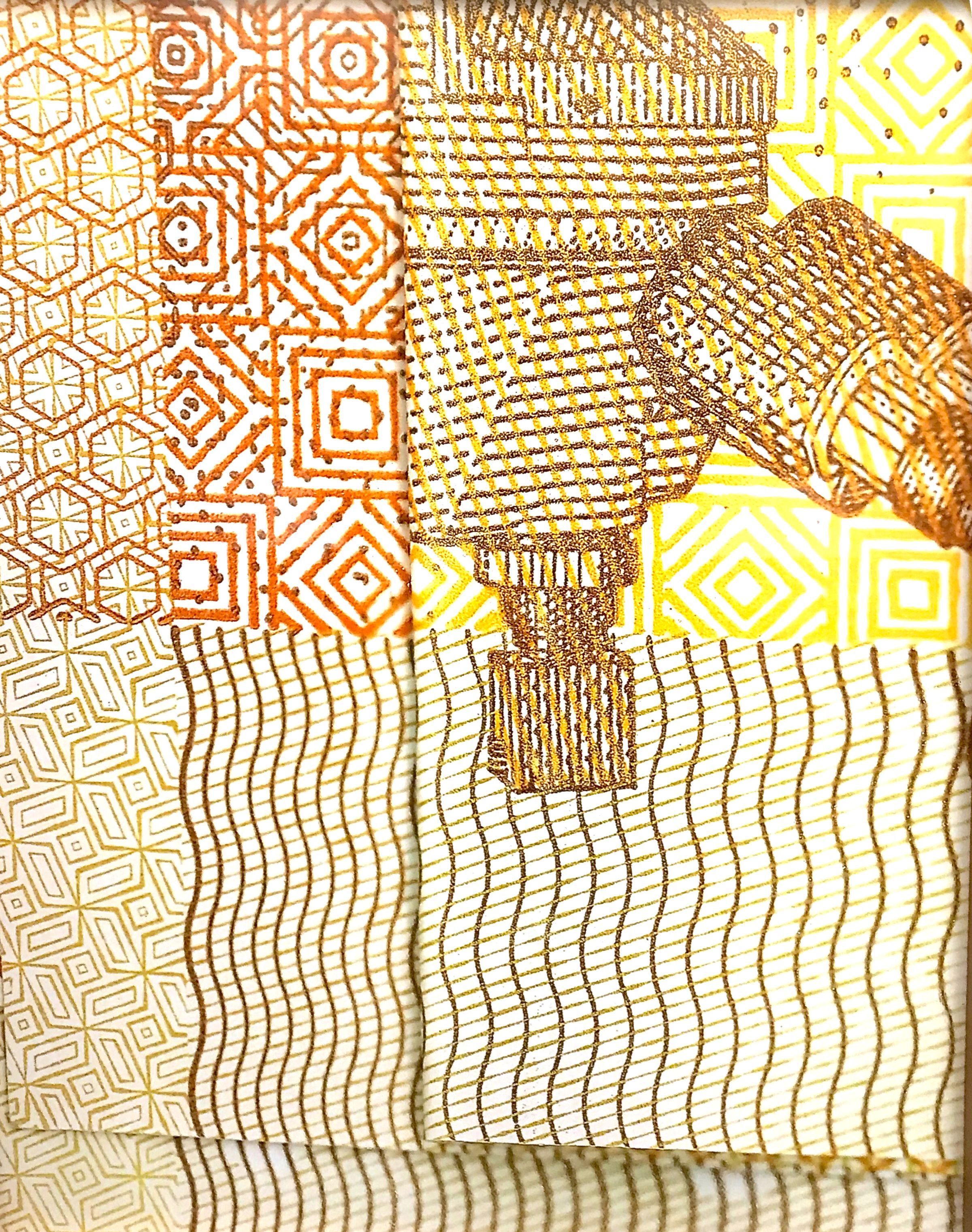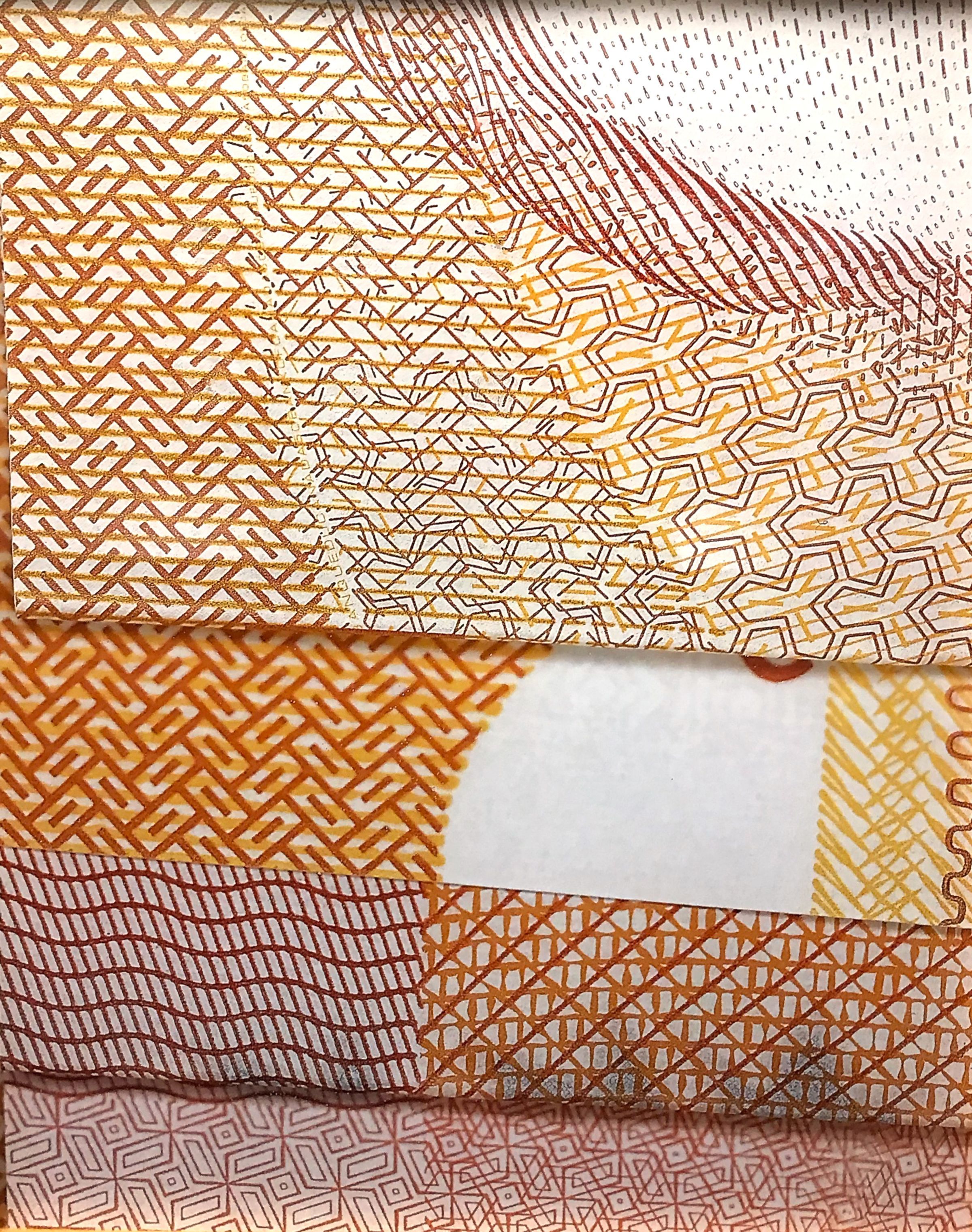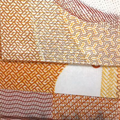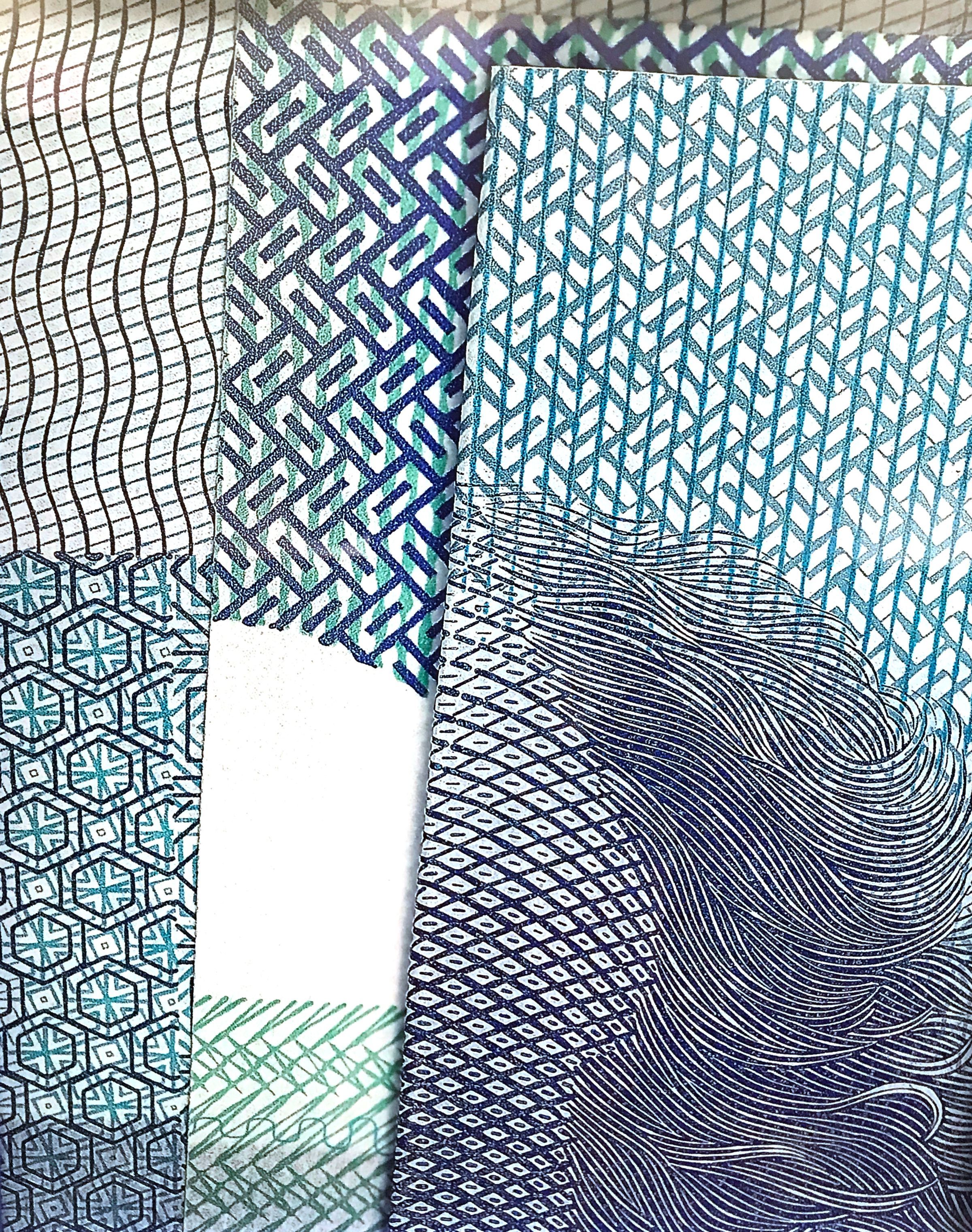 Jasper, Elizabeth, Wilfrid, Zeiss, William (2014) are digital prints of varying denominations of Canadian currency. The artist folded each bill and digitally enlarged it until the embedded security features were no longer perceptible to the technology and the familiar imagery felt foreign to the eye. The resulting images appear like Japanese origami paper or textile cloth as ornate textile-like patterns emerge from the layered folds.