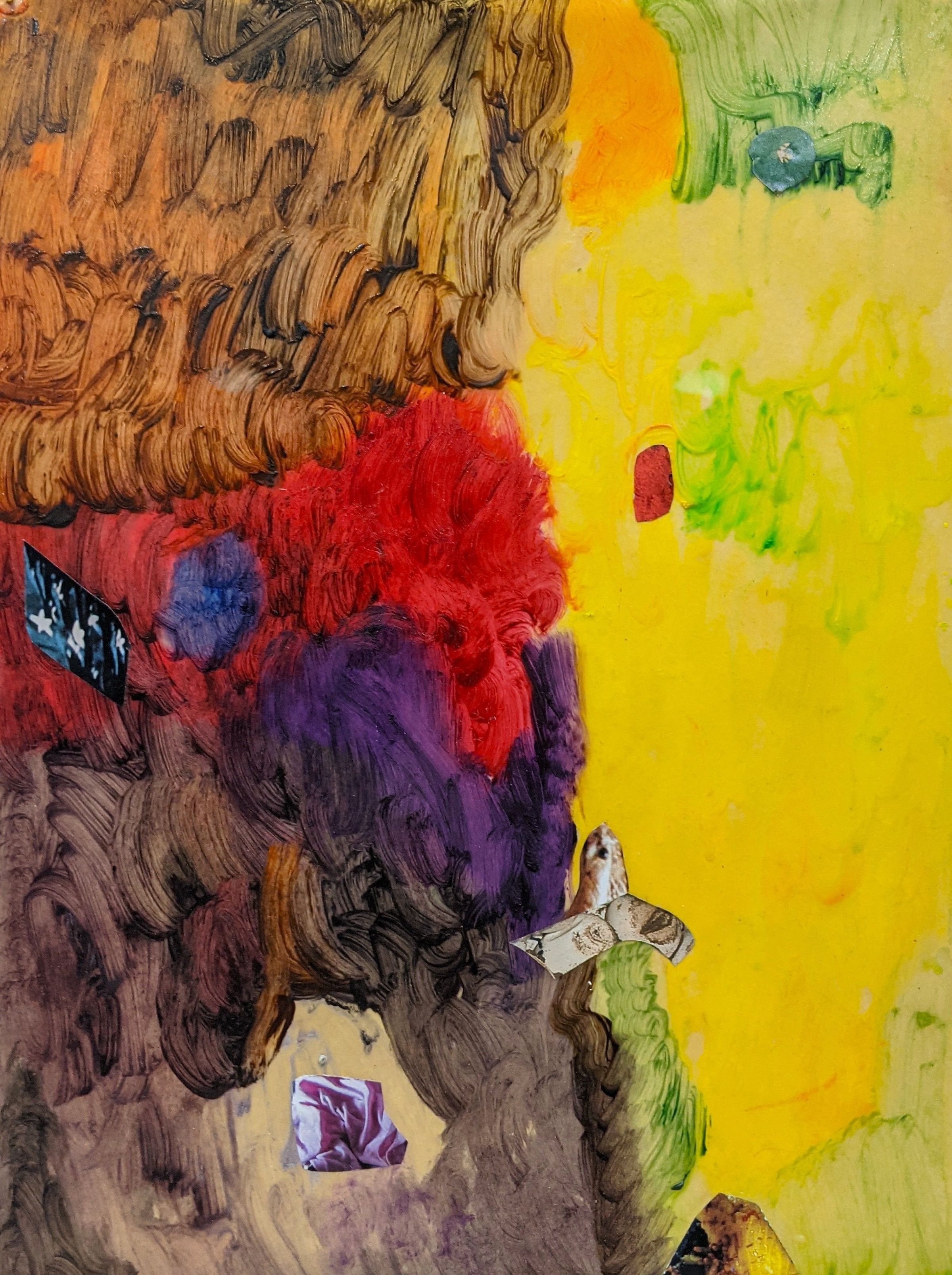 Hill’s paintings are tactile, time-intensive works that blur the boundaries between image, object, and archive. Her process begins with coating paper in tobacco-infused Crisco oil, a ritual that requires weeks or months of drying. This oily substrate becomes a living surface—absorbing pigment, scent, and memory—before Hill layers it with wildflowers, beer can tabs, rabbit fur, press-on nails, and magazine cutouts.