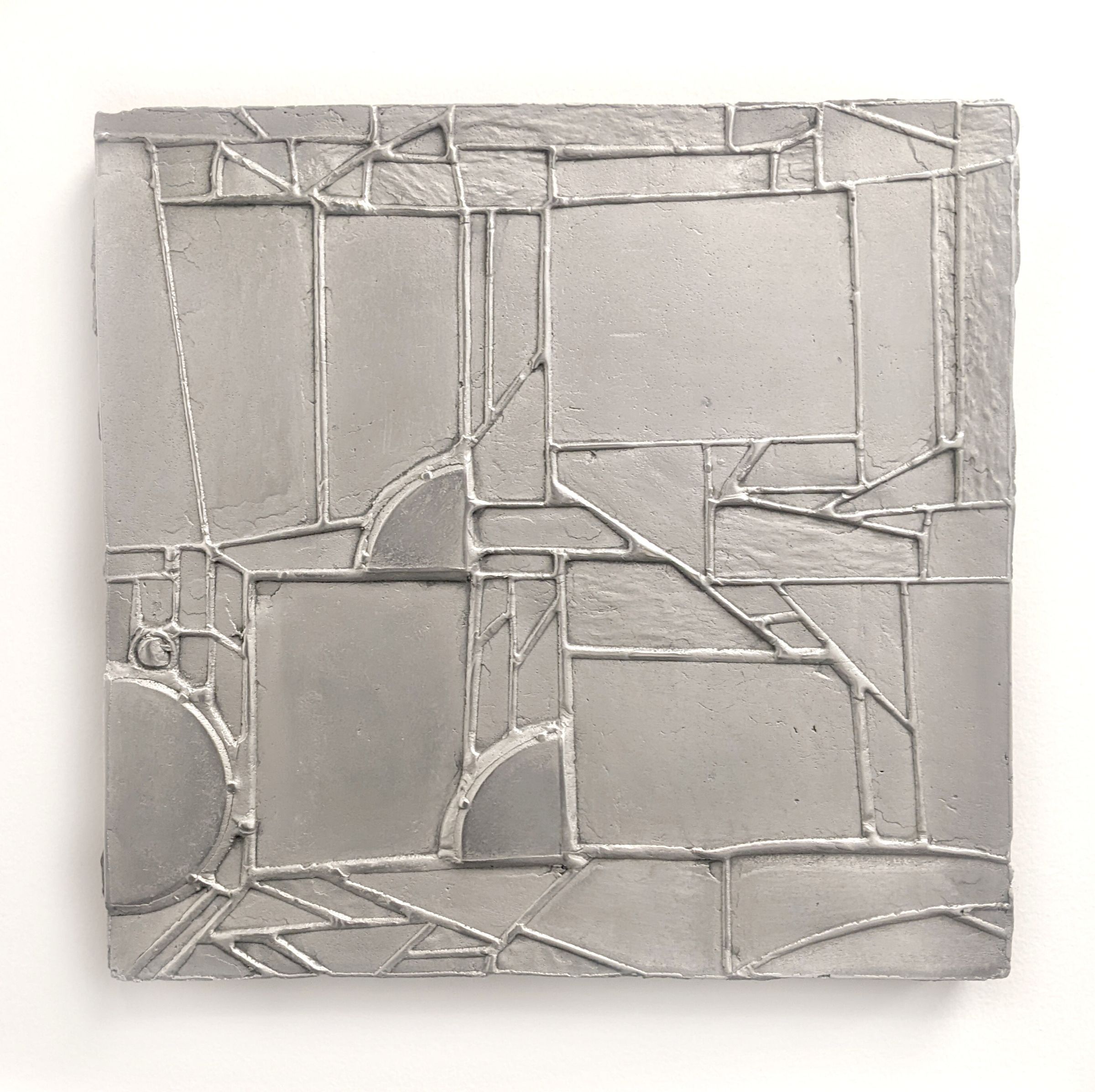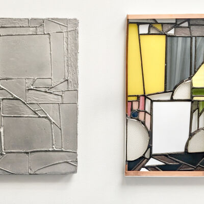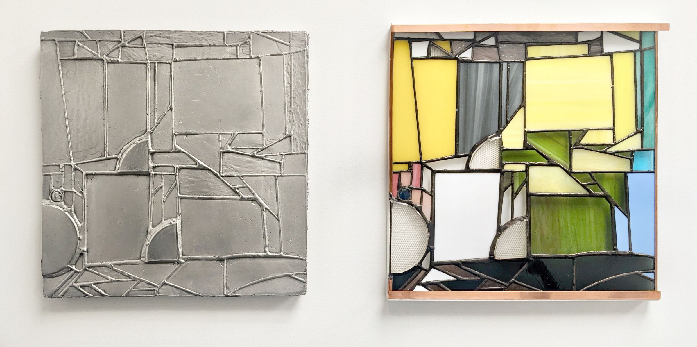 Between '17 and '18 is a set of two works made of different materials (aluminum and stained glass) that depict the same design. Knowles plays with each medium to highlight how the differences in optical effects and tactility changes how the artworks are experienced.