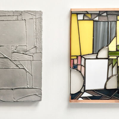 Between '17 and '18 is a set of two separate artworks made of different materials (aluminum and stained glass) that depict the same design. Knowles plays with each medium to highlight how the differences in optical effects and tactility changes how the artworks are experienced.