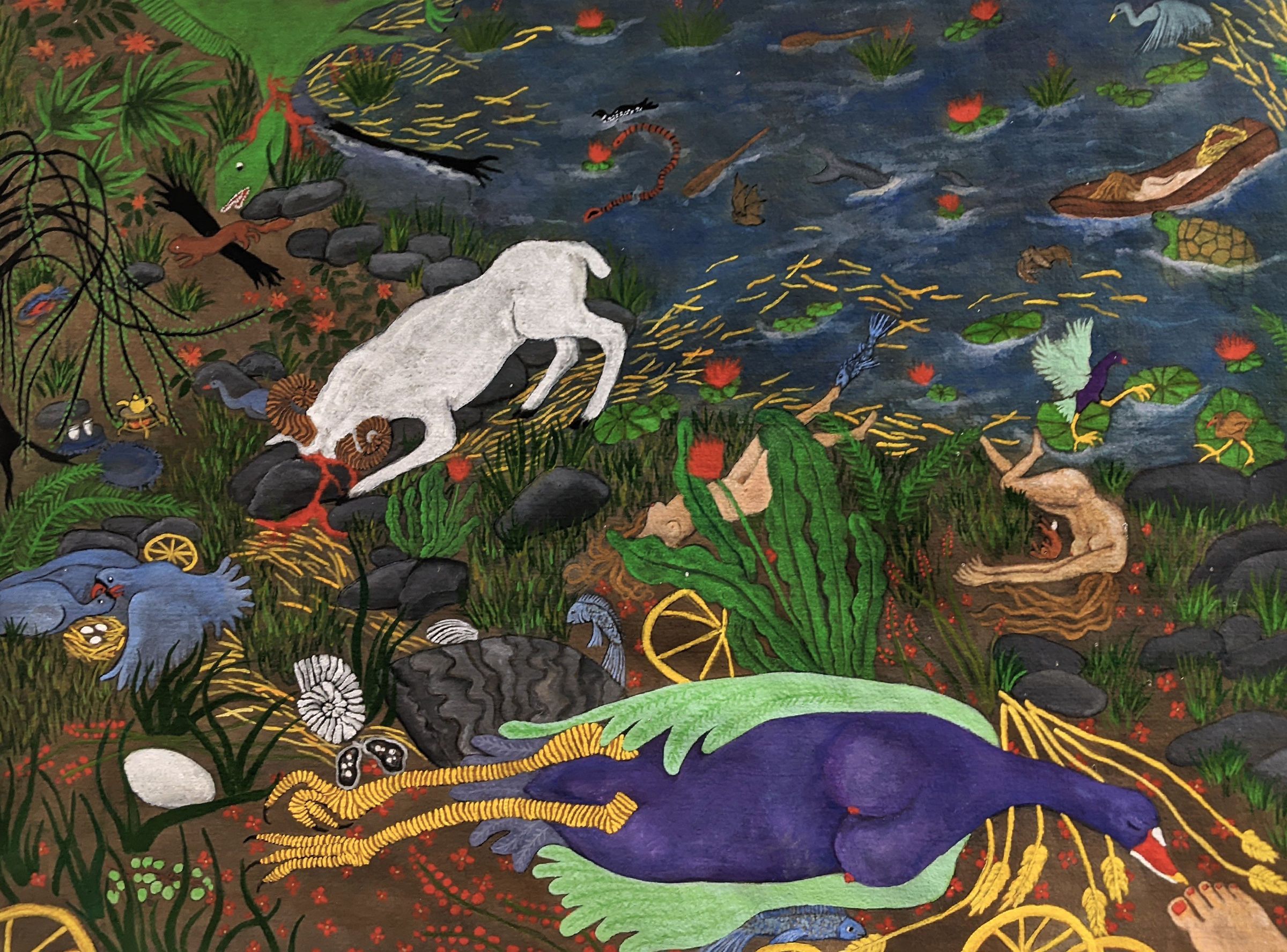 Bertheaud's works delves into theinterplay of beauty and absurdity. Her vibrant paintings and tapestries depict fantastical realms inhabited by hybrid creatures navigating surreal landscapes. These environments are imbued with a sense of underlying tension, featuring protective maternal figures, and unseen dangers.