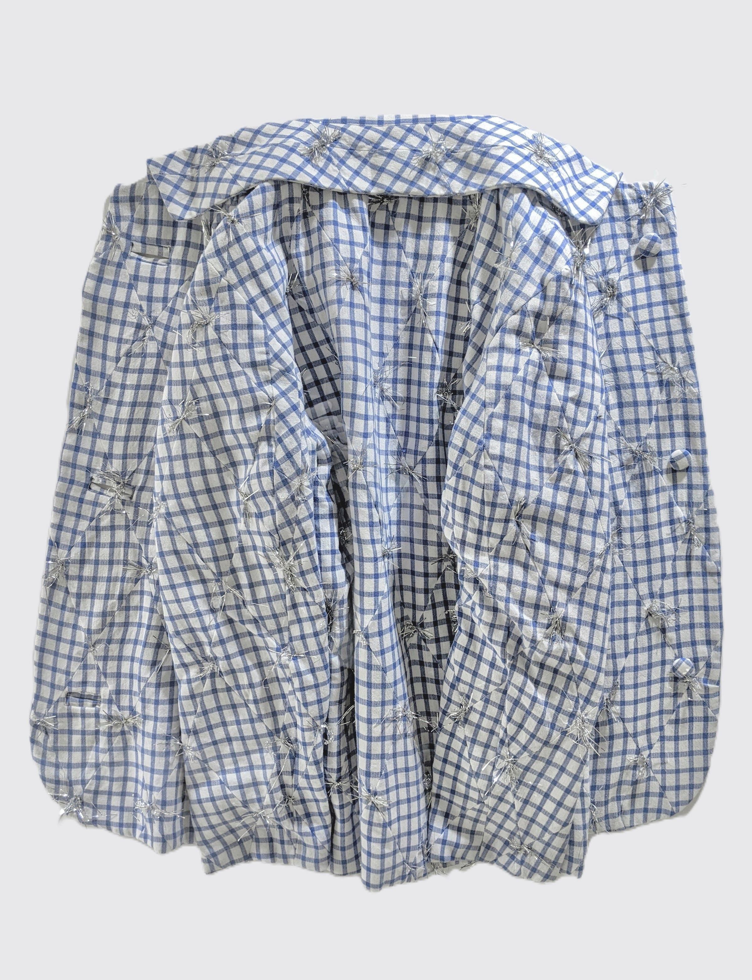 “Daisy” is constructed from blue cotton plaid. Often associated with farming and rural culture, the artist playfully uses the fabric to emphasize the wider history of the material, it’s form, and design, while simultaneously creating a narrative around the individual object.Artwork Details