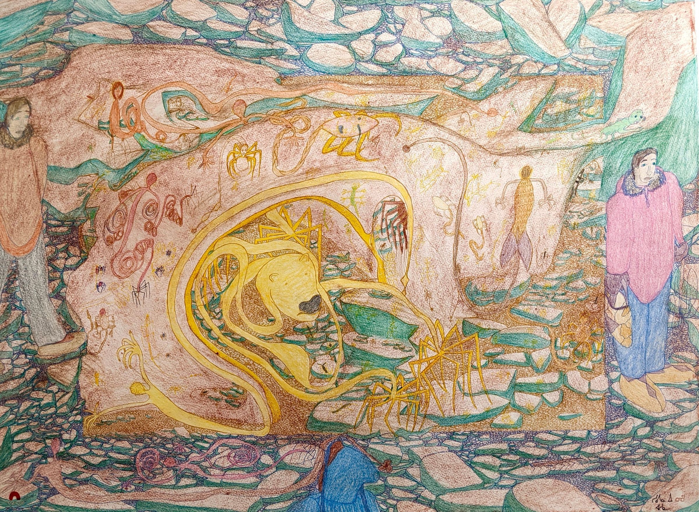 Working mainly in drawing and print, Ashoona is known for her playful and personal imagery and vibrant compositions that range from depicting daily life in Kinngait to visions of a future fighting other-worldly creatures. Her art navigates past and present relationships between nature and humanity as well as Inuk identity to convey diversity and changes in the community and landscape.Artwork Details