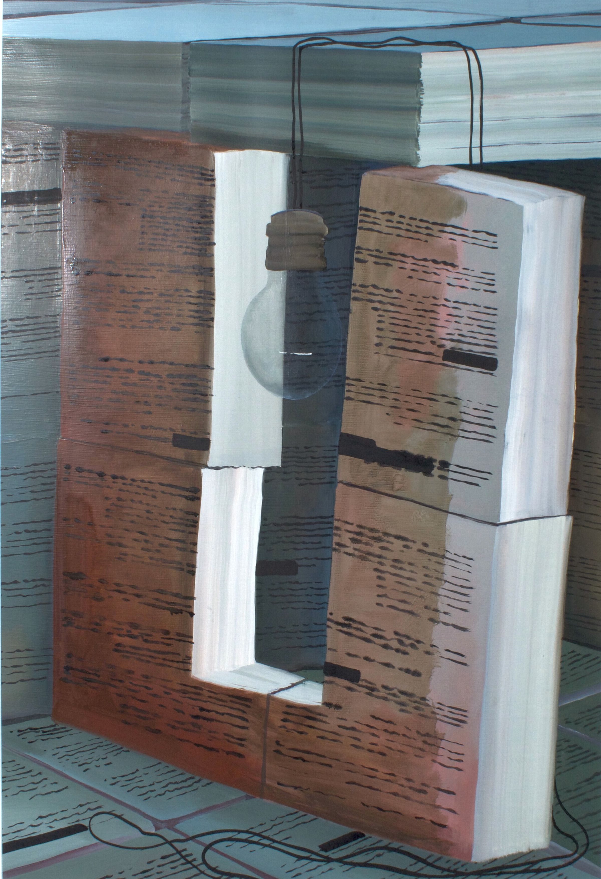 Zack's more recent works concern themselves with the relationship between information and the institutions that maintain this knowledge. The artists paint dream-like structures made of books, redacted documents, and text, often depicting light bulbs within them. His artworks serve as metaphors for the sources of power that control the flow of information. Zack sees these imagined spaces as prisons built by those who have manufactured knowledge and meaning throughout history. The landscape is shown as full yet incomplete, chaotic yet intentional. The redactions and edits make it clear that no matter how well organized our knowledge is, it is imperfect and restrictive at best.