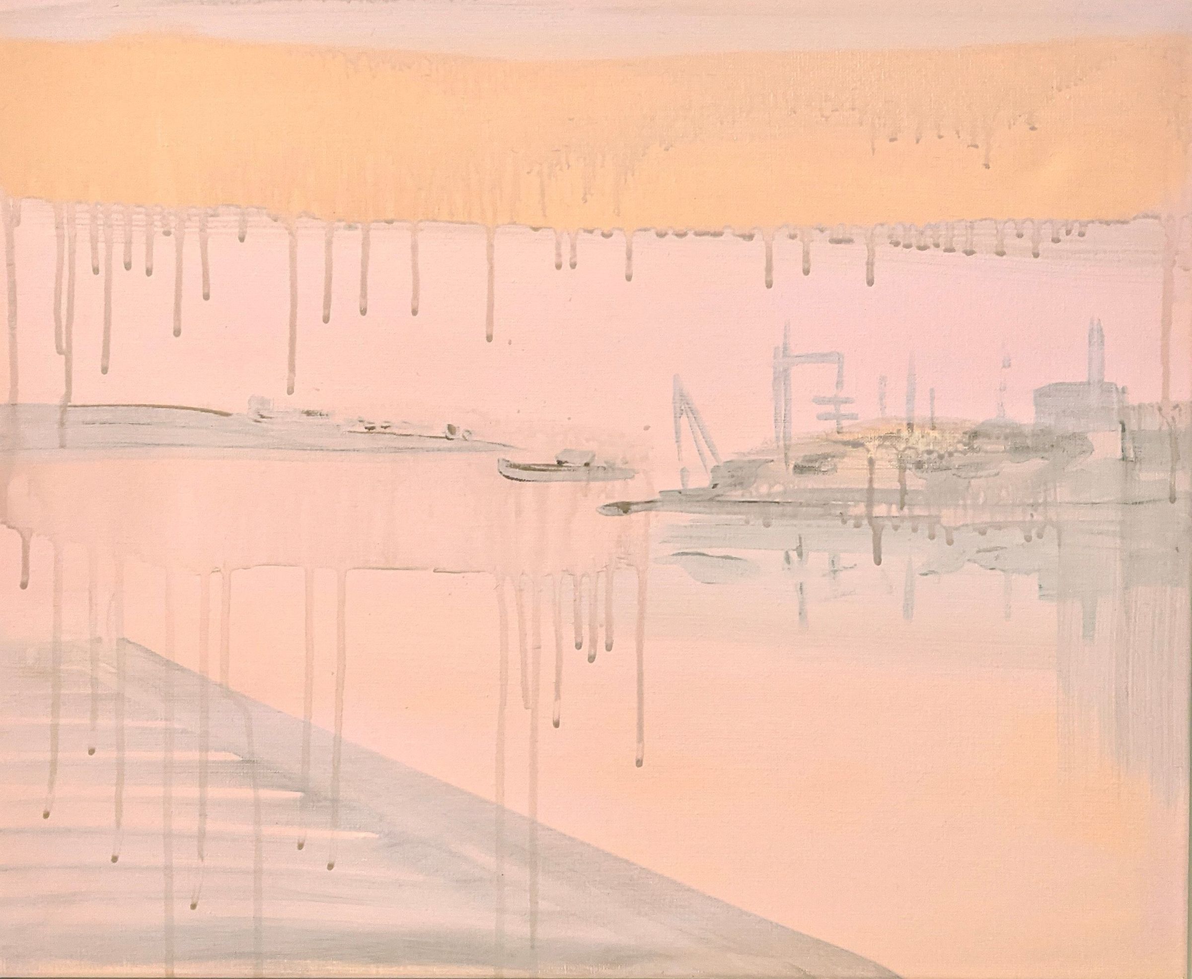 Lisa lives on that Island (2016) is part of a series of works that depicts the scenery of her voyage along the Saint Lawrence Seaway on a cargo ship. The drips of paint down the canvas reference the porthole where the artist looked at the waters and shoreline.