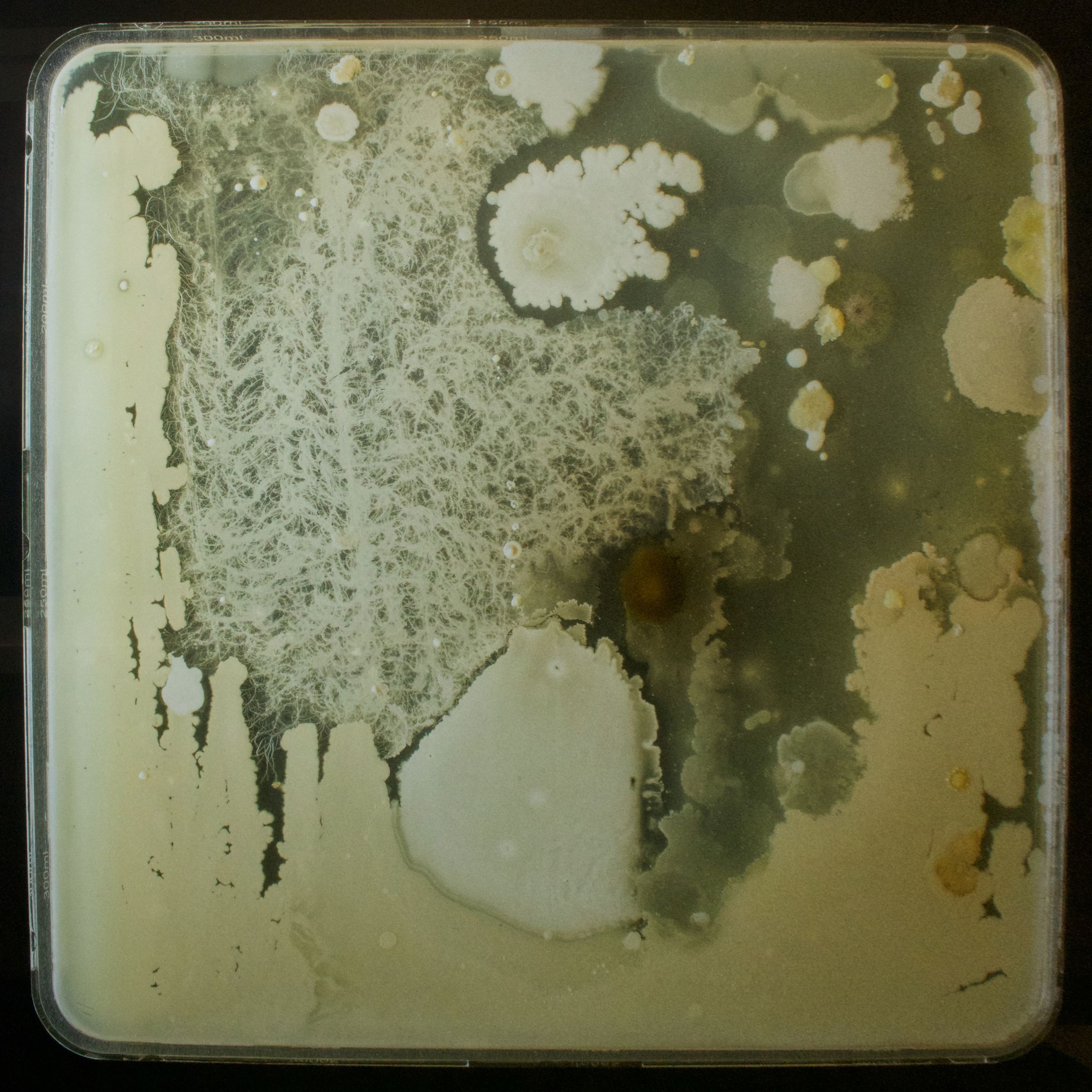 In his series Microbe Swabs (2013-), Sasaki worked with the McMichael Art Gallery in Vaughn, Ontario to grow bacterial cultures swabbed from the paint pallets and tools of artists from the Group of Seven and Tom Thomson. The resultant Petri dishes appear like colourful, abstract landscapes that recall the original paintings of these landscape artists. Sasaki aims to give playful homage to these prolific Canadian artists using the growth of bacteria as a metaphor for their creative legacies, which continue to live and grow in unexpected ways. Using their tools as the source of his work, Sasaki, originally a landscape painter, connects himself as part of a new generation of artists that are inspired by, and cultivate from, the creative practices of historic artists.