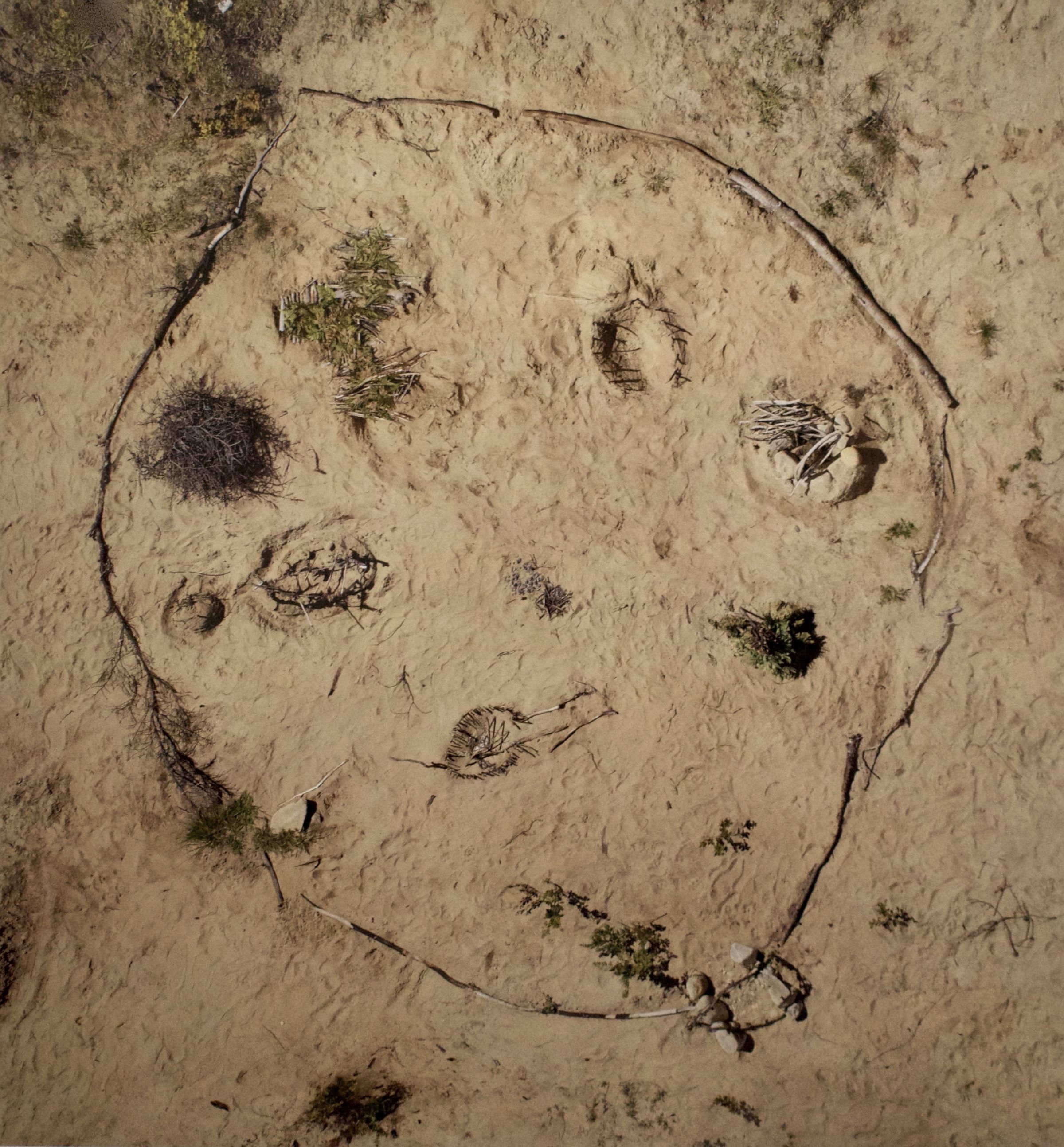 Oasis (2008) establishes a strange bird's-eye point of view of what appears to be a sandy landscape dotted with vegetation, dead plants, and other detritus. Captured in composition are small sand sculptures that the artist's daughter made during a