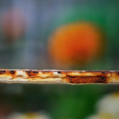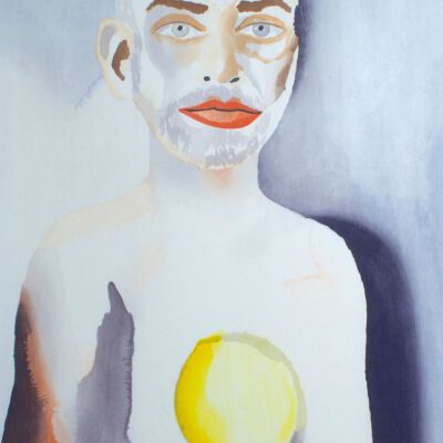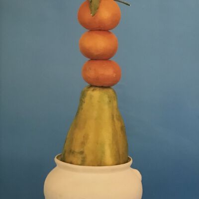 Ceramic Bowl with Papaya and Clementines on Blue with Middle Grey (Abundance, Anxiety, Balance, Citrus Collapes, Digestion, Distribution, History, Isolation, Meditation, Precarity, Saturation, Storage, Uncertainty)