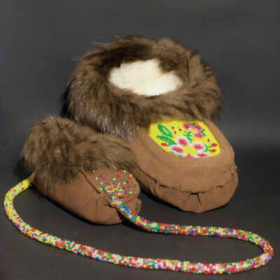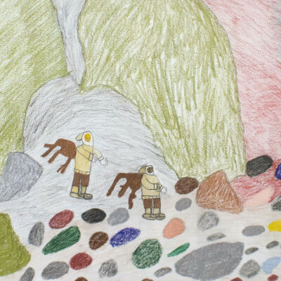 Two Inuit are walking Through The Mountains and one are carrying caribou on there back in June