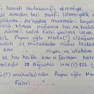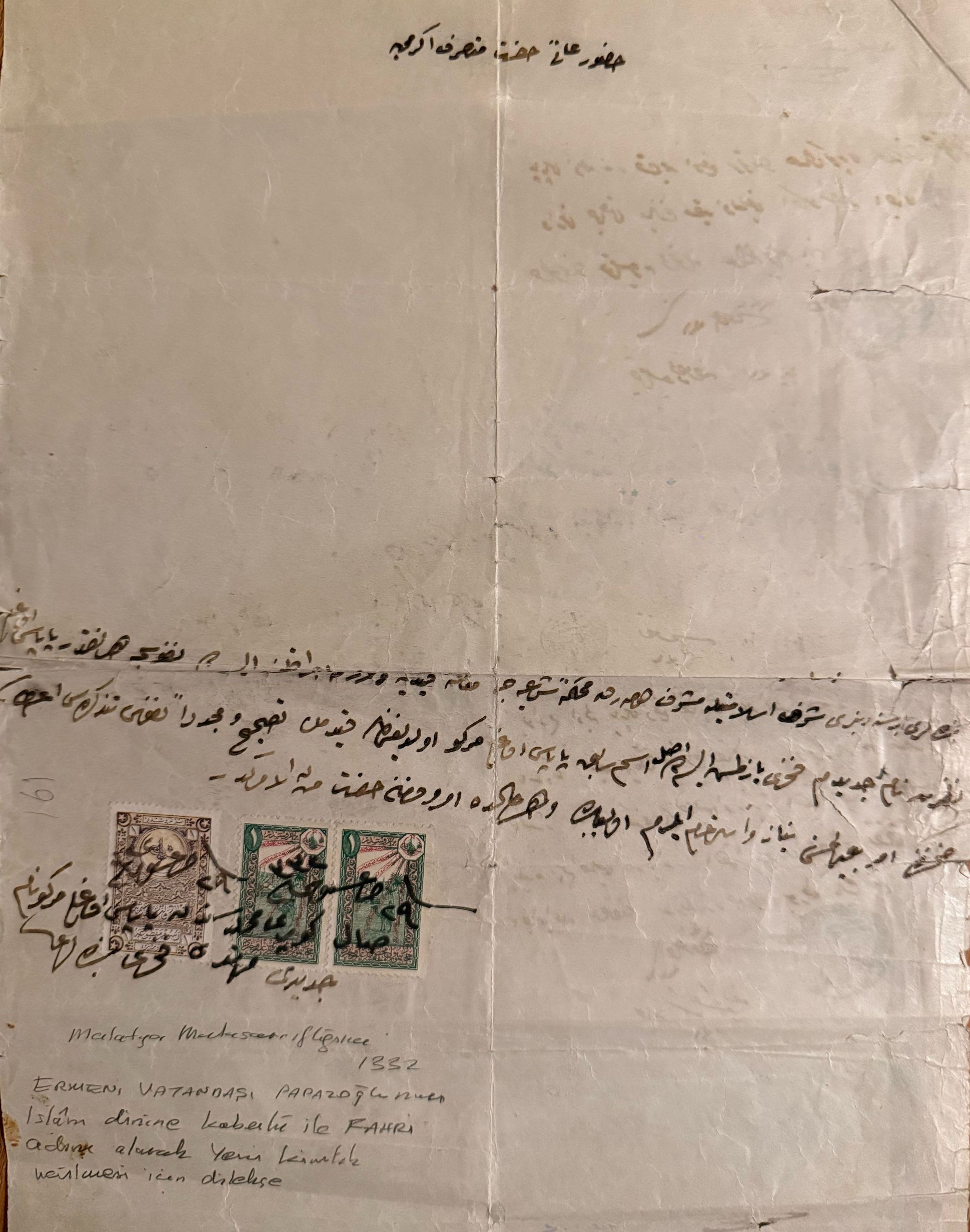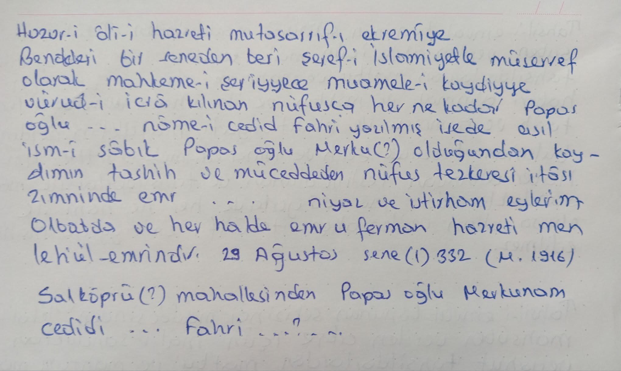 This Ottoman document, dating from 29 August 1332 Rumi (11 September 1916), is an official record of conversion to Islam issued by the local administration and confirmed by the Sharia Court. It records that a person named Marko Papaz oğlu (Papazyan) embraced Islam, expressed in Ottoman as “İslamiyetle müşerref,” meaning “honored with Islam.” Following his conversion, his new Muslim name, Fahri, was written and registered, indicated by the phrase “isede yazılmış,” and a new identity certificate (“müceddeden nüfus tezkiresi”) was issued to him. This was done in accordance with the order and decree of the governing authority (“ferman hazreti,” “emr-u halde”), and the report was presented to the Mutasarrıf, the provincial governor, respectfully referred to as “huzur-ı aliye-i hazret-i mutasarrıf-ı ekremiye.” The stamps at the bottom confirm that the appropriate administrative fees or taxes were paid for the registration.