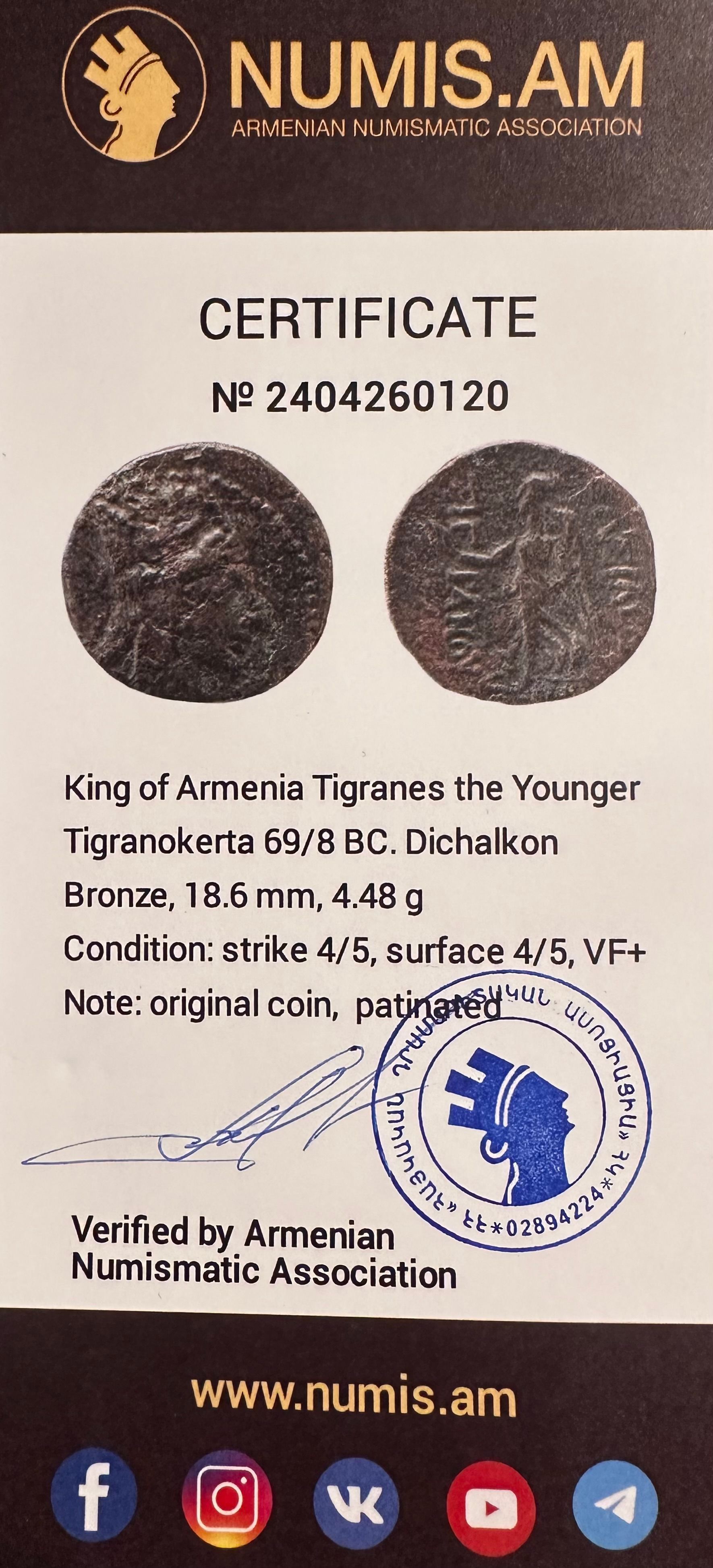 Today, the Dichalkon of Tigranes II is considered rare and highly collectible. Numismatic catalogs often rate its rarity very high, making it a prized artifact for collectors and historians. Its scarcity and the rich history it represents make it a significant piece for understanding the political and cultural dynamics of ancient Armenia during Tigranes’ reign.Mintage