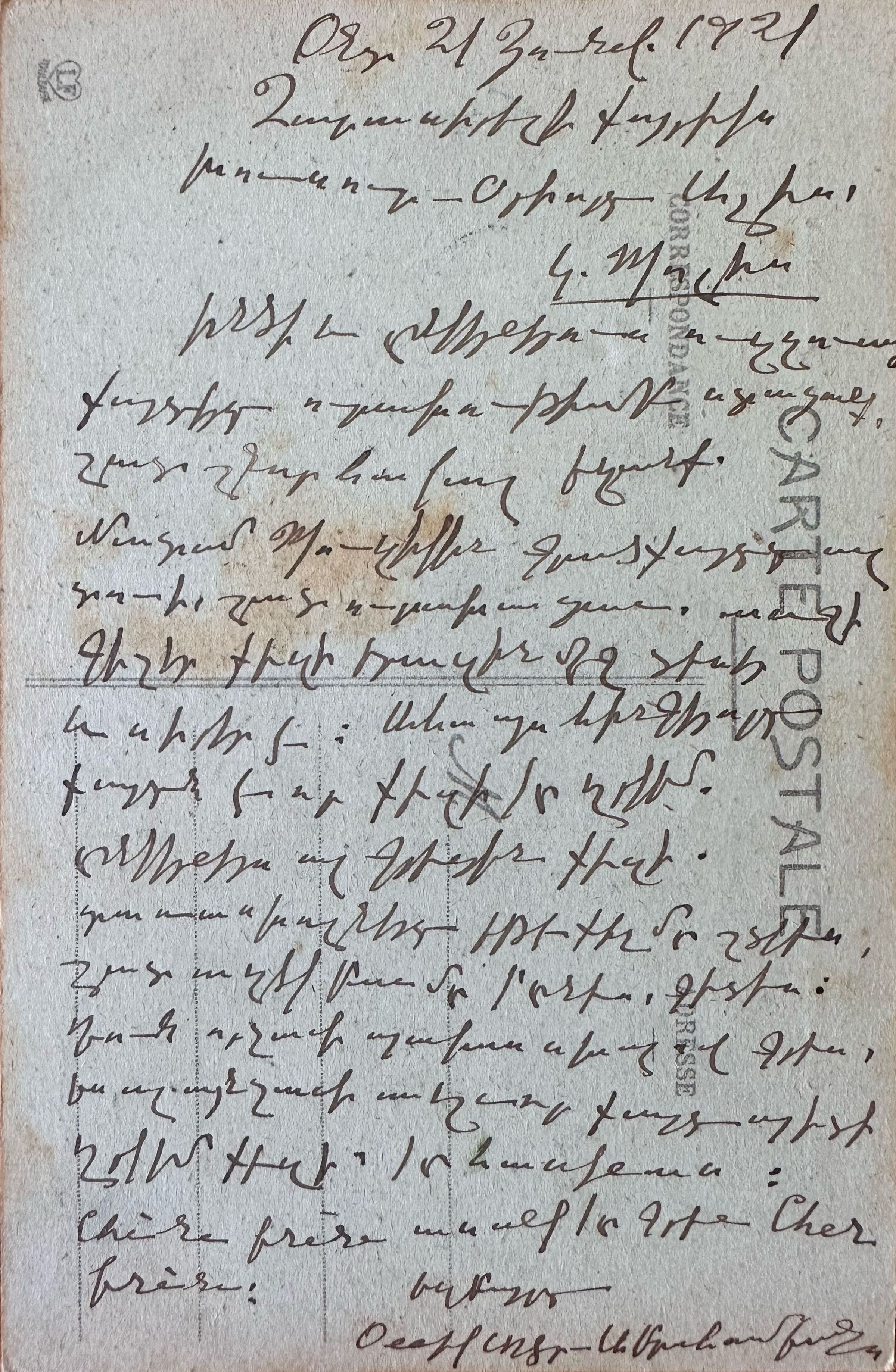Ինծի և ընկերներիդ ուղղուած քարտդ ուրախութեամբ ստացանք, շատ շնորհակալ ենք։ Մատամ Պուզիկին գրածդ քարտդ ալ տուի, շատ ուրախացավ, առջի գիշեր քեզի երազին մէջ տեսեր և սիրեր է։ Ահա այս հինգերորդ քարտն է որ քեզի կը ղրկեմ։ Ընկերներս ալ գրեցին քեզի։ Տառասխալների եթէ քիչ մը շտկես, շատ աղեկ բան մը կ'ընես, գիտես։Դուն որչափ պակաս սխալով գրես, ես անչափ աղուոր քարտ պիտի ղրկեմ քեզի, կը հասկանաս։ Chère frère, ասանկ կը գրուի , cher frère.