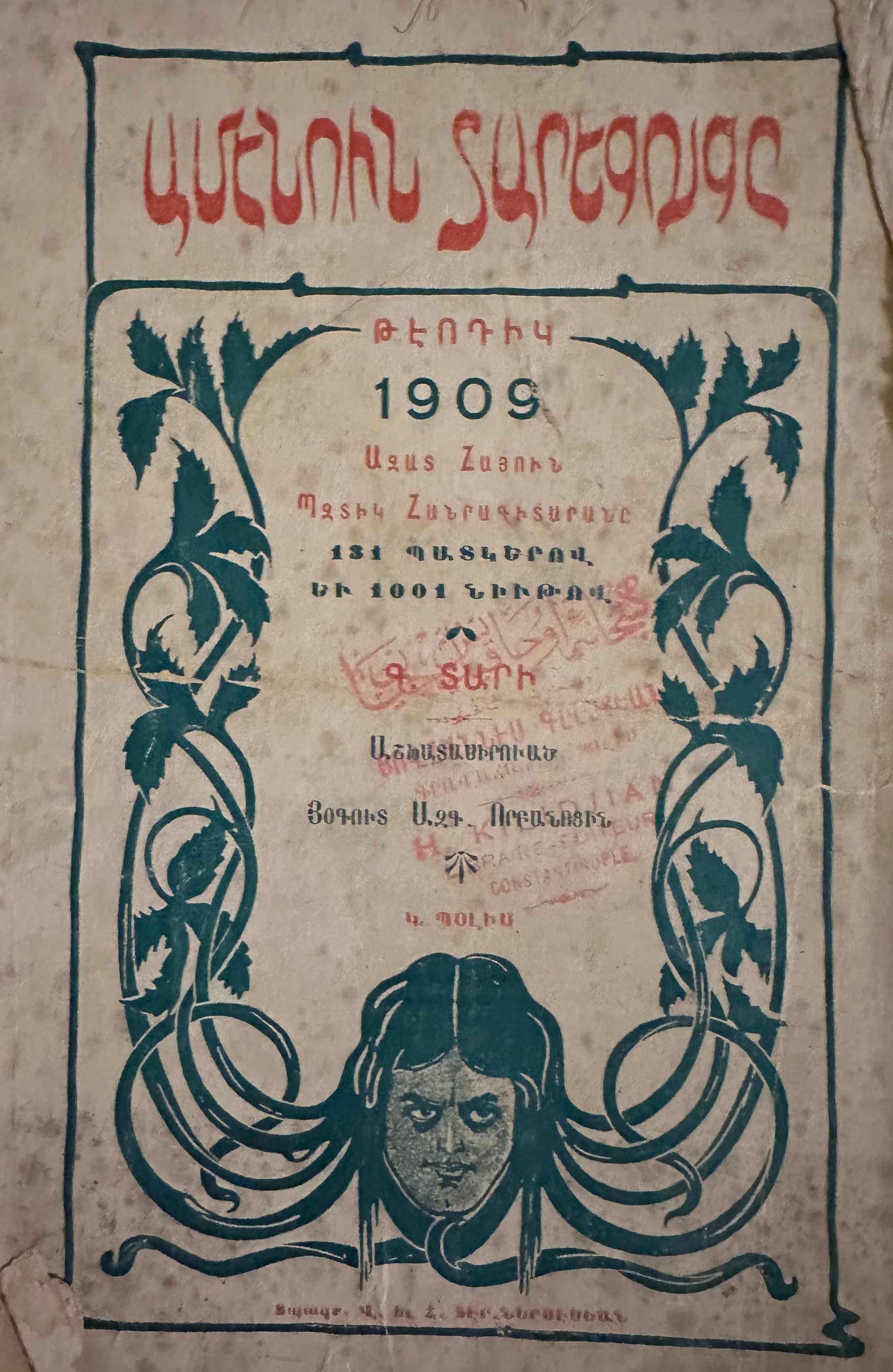 Teotig, a native of Constantinople, was the publisher of the vastly popular yearbooks entitled Everyone's Almanac (published from 1907-1929). Teotig’s Everyone’s Almanac aimed to make knowledge accessible to a broad audience. It included a mix of practical information, historical facts, cultural insights, and literary works. Its primary goal was to educate and entertain Armenians while fostering a sense of national identity and cultural pride. They were released New Years Eve every year which means the information found in the Almanac was for the preceding year (1908).Inscription/Signature/Marks