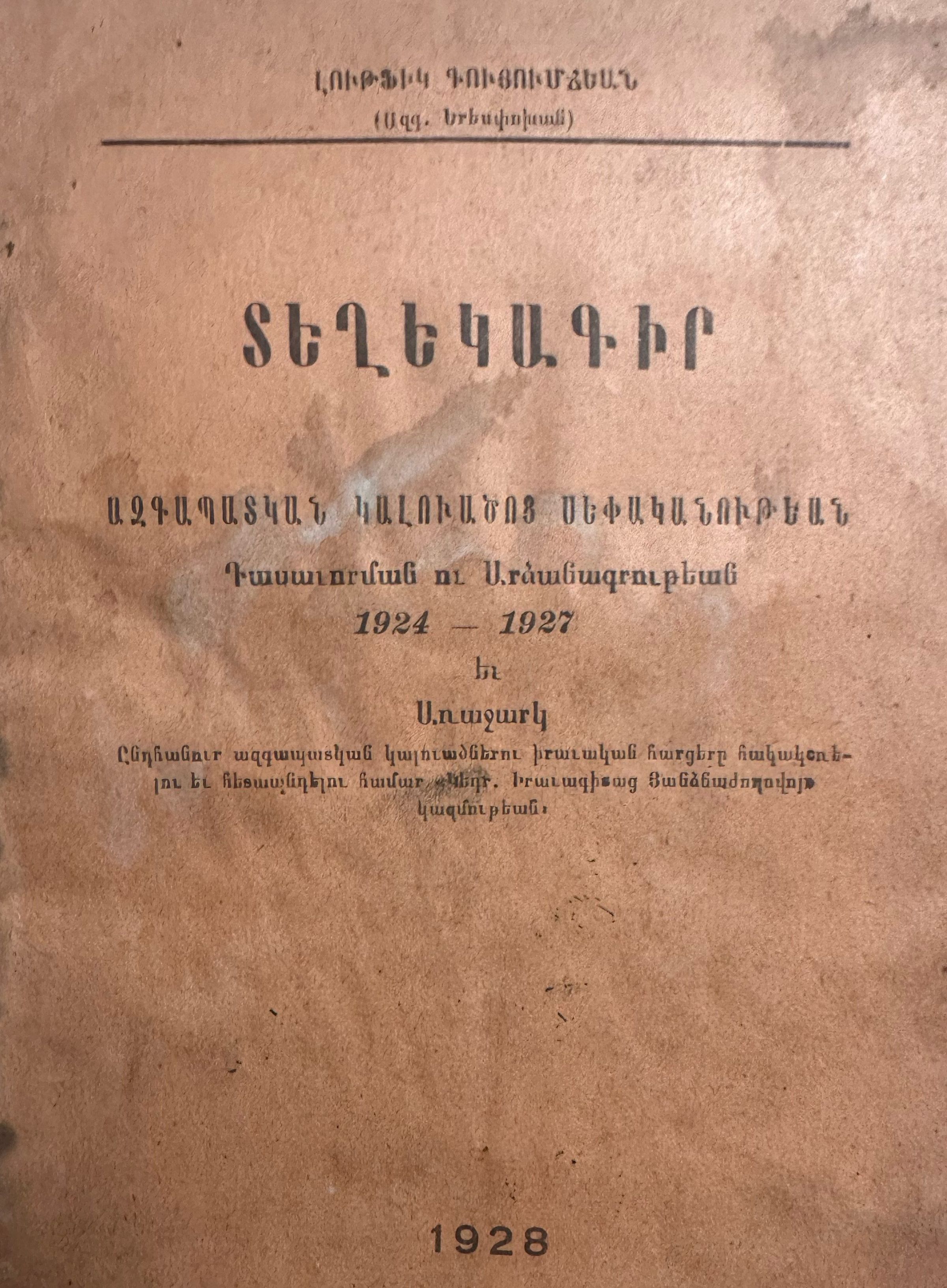 Տեղեկագիր ազգապատկան կալուածոյ սեփականութեան ։ Դասաւորման ու Արձանագրութեան 1924-1927 և Առաջարկ ընդհանուր ազգապատկան կալուածներու իրաւական հարցերը հակակշռելու և հետապնդելու հհամար ՛Կեդր. Իրաւագիտա Յանձնաժողովոյ՛ կազմութեանDescription