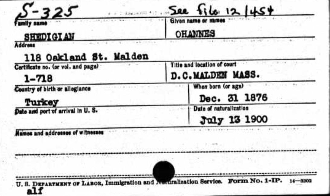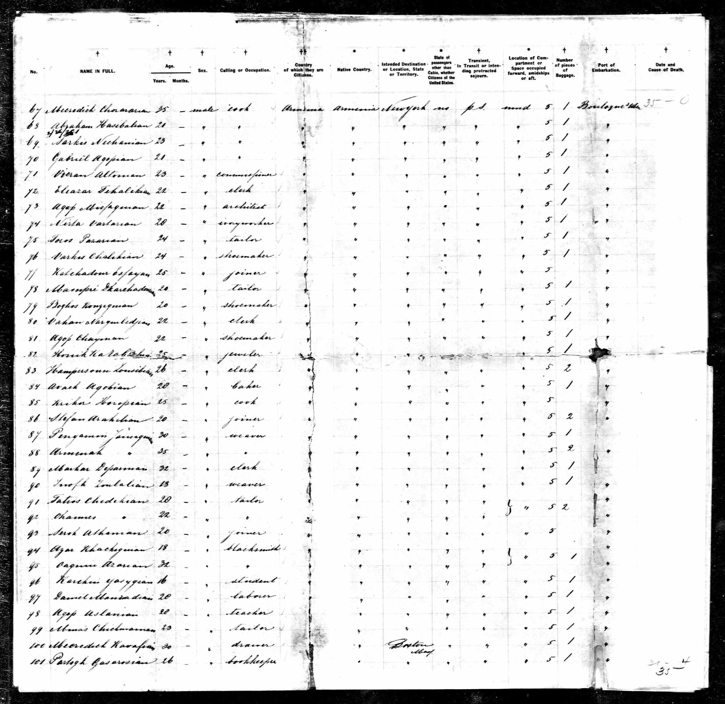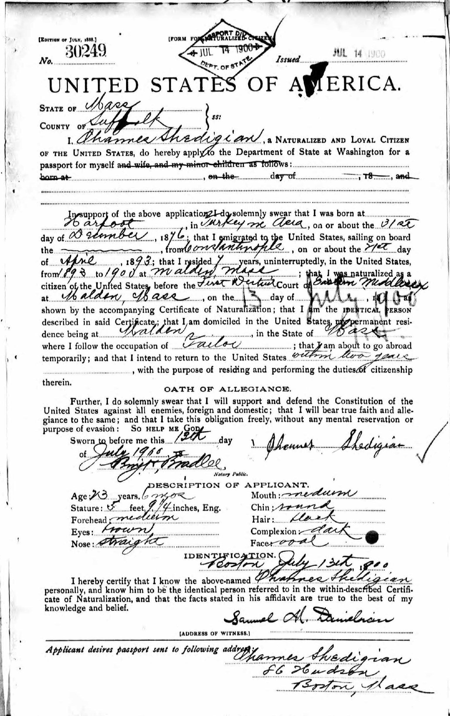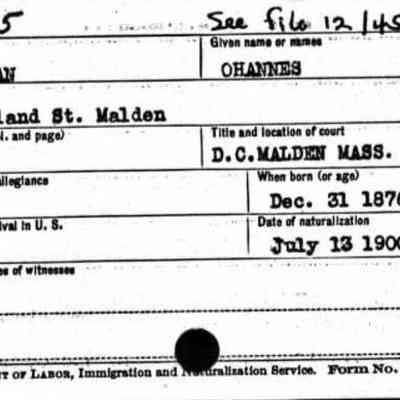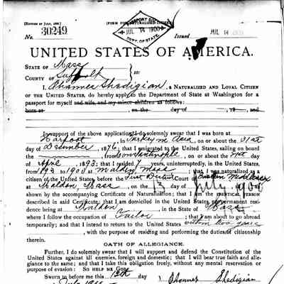 It was decided that one family member would always remain in the village while another worked abroad. In 1893, Hovhannes moved to Constantinople, and his uncle Tateos returned to Sağmiga. However, about a year and a half later, Tateos also went to Constantinople. In 1895, during the great upheavals and massacres of Armenians in the city following the Ottoman Bank takeover, the two decided to flee. They first sought refuge at the British Embassy, from which they were placed on a Greek ship bound for Piraeus, then continued on to Marseille. After a brief stay in Paris, they traveled to Boulogne in northern France, where they boarded a Holland America Line vessel. On 19 October 1896, Hovhannes immigrated to Massachusetts. He immediately found work next to a tailor. He became a naturalized citizen in 13 May 1900.
