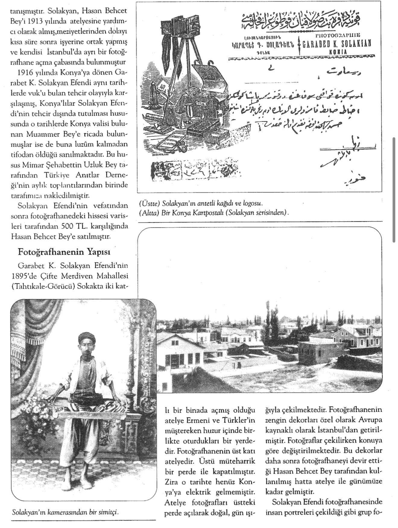 The biographical details of Garabet Solakyan remain only partially known. Neither his place of birth nor his date and place of death are documented with certainty. Contemporary references indicate that he was active in Konya by 1895 and established his studio near Alâeddin Hill, on today’s Vali İzzet Bey Street, in Görücü Sokak. He had two assistants—Hasan Behçet Bey and Agop Bey. Oral testimony suggests that he adapted quickly to local life, adopting regional dress and participating in popular pastimes such as pigeon keeping. Surviving correspondence written between 1913 and 1915 to his assistant and later business partner Hasan Behcet Bey demonstrates his fluent command of Ottoman Turkish and adherence to refined epistolary etiquette.