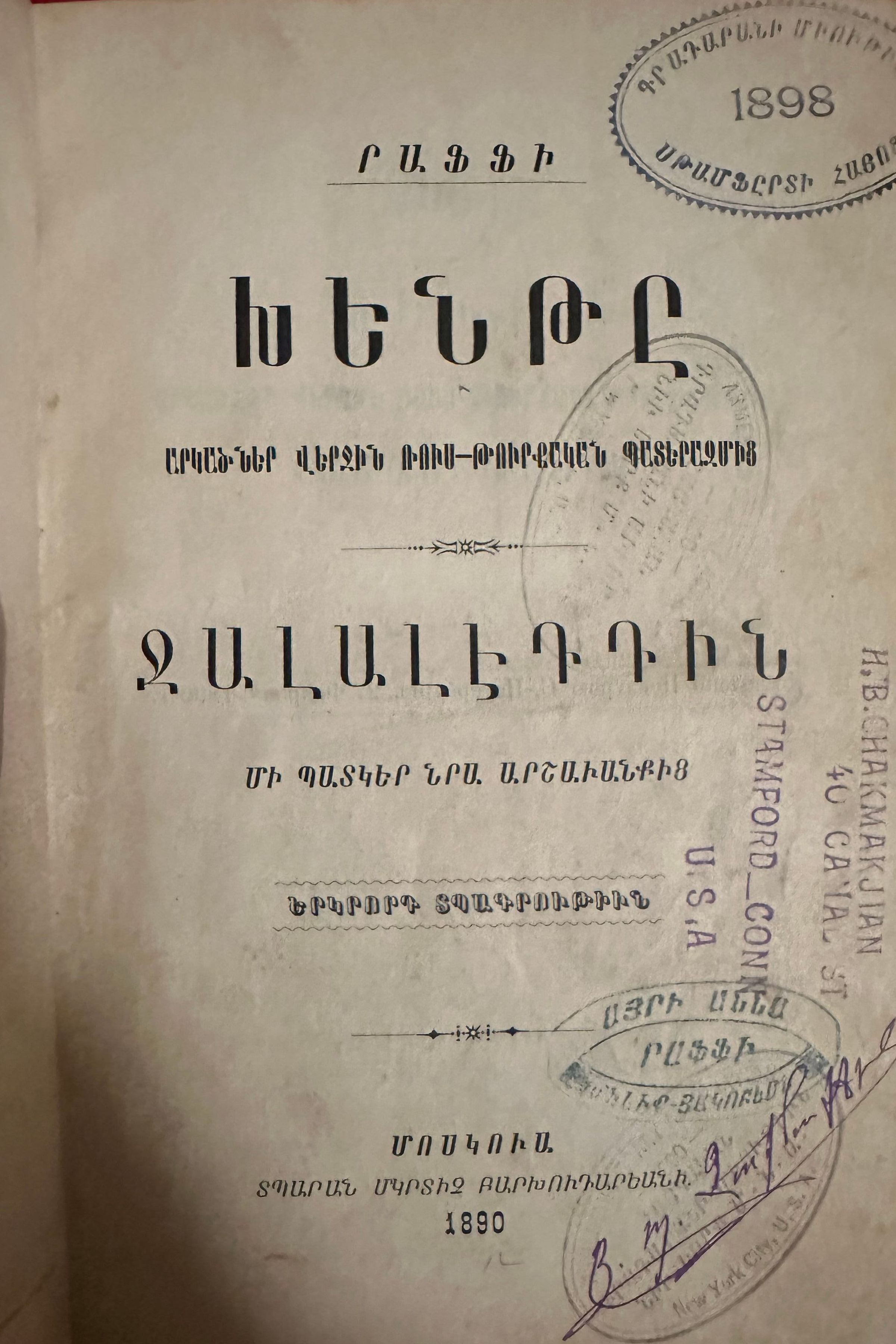 Ink stamp on title page: ԱՅՐԻ ԱՆՆԱ ՐԱՖՖԻ ՄԷԼԻՔ-ՅԱԿՈԲԵԱՆ [Anna Raffi, widow of the author Raffi]