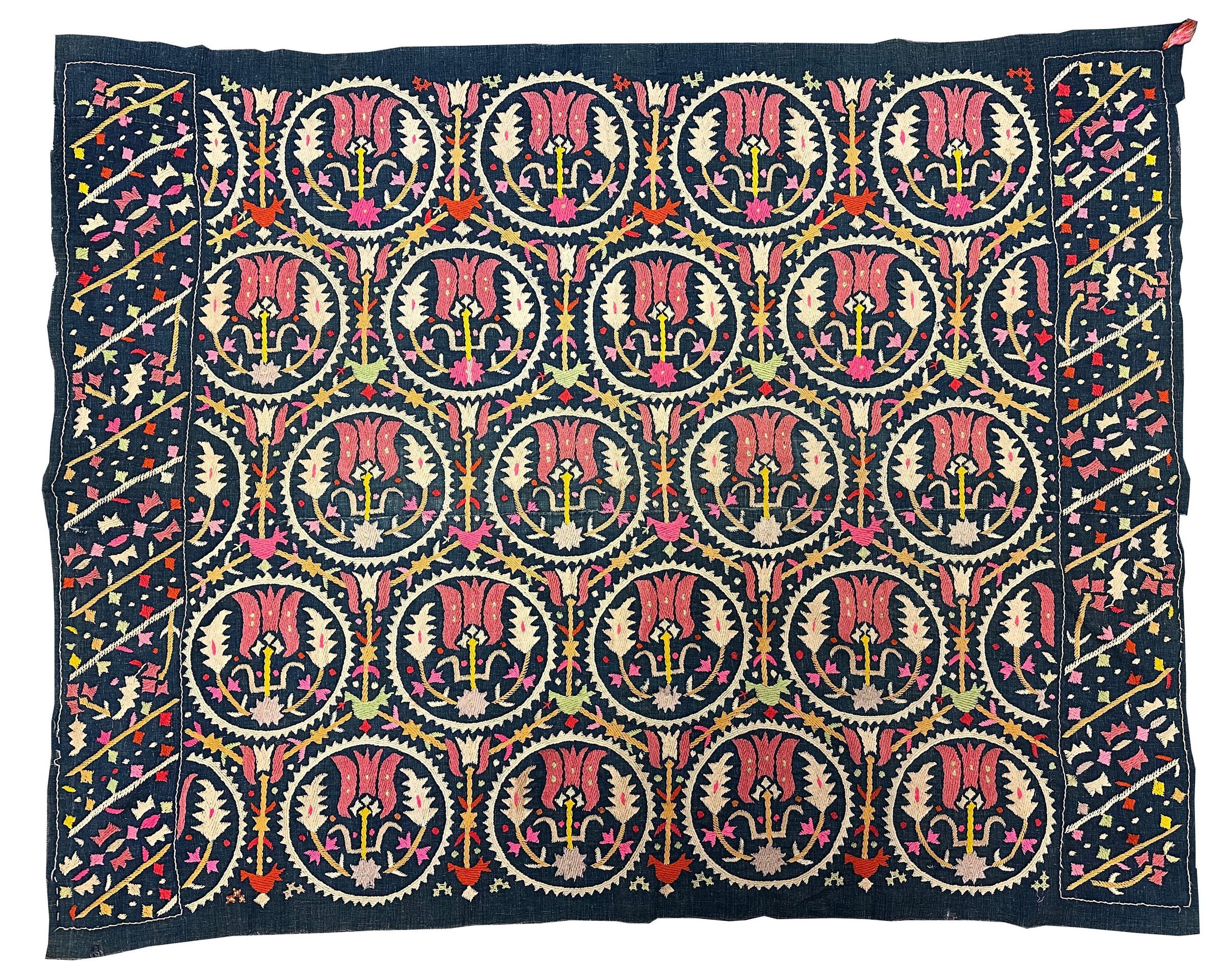 Historically, Marash was home to a diverse population, including a vibrant Armenian community celebrated for their exceptional skills in embroidery, weaving, and metalwork. These artisans played a vital role in shaping the region’s textile arts, blending their own traditions with broader Ottoman influences. Armenian needlework from Marash is particularly noted for its intricate, symmetrical designs inspired by nature, geometric patterns, and religious motifs. A notable example is a large textile featuring horizontal rows of embroidered flowers—possibly used as a hanging or tablecloth—as well as this antique Armenian Marash antependium from circa 1900. This rare panel, preserved in exceptionally fine condition, displays fresh, bright, barely unfaded colors, with five to six different shades hand-embroidered onto a dark blue, hand-woven cloth. Such pieces exemplify the refined artistry and technical mastery characteristic of Marash embroidery.