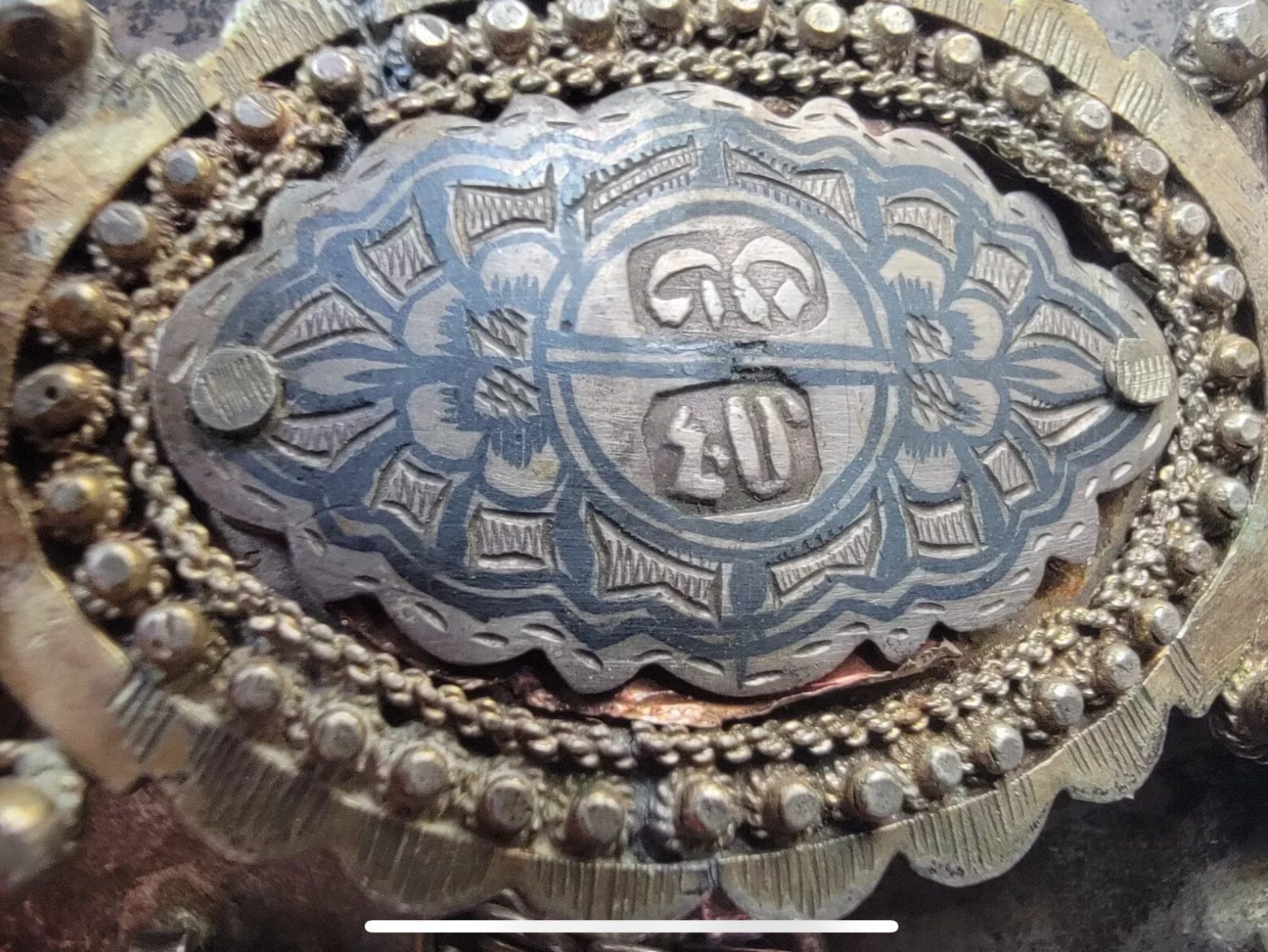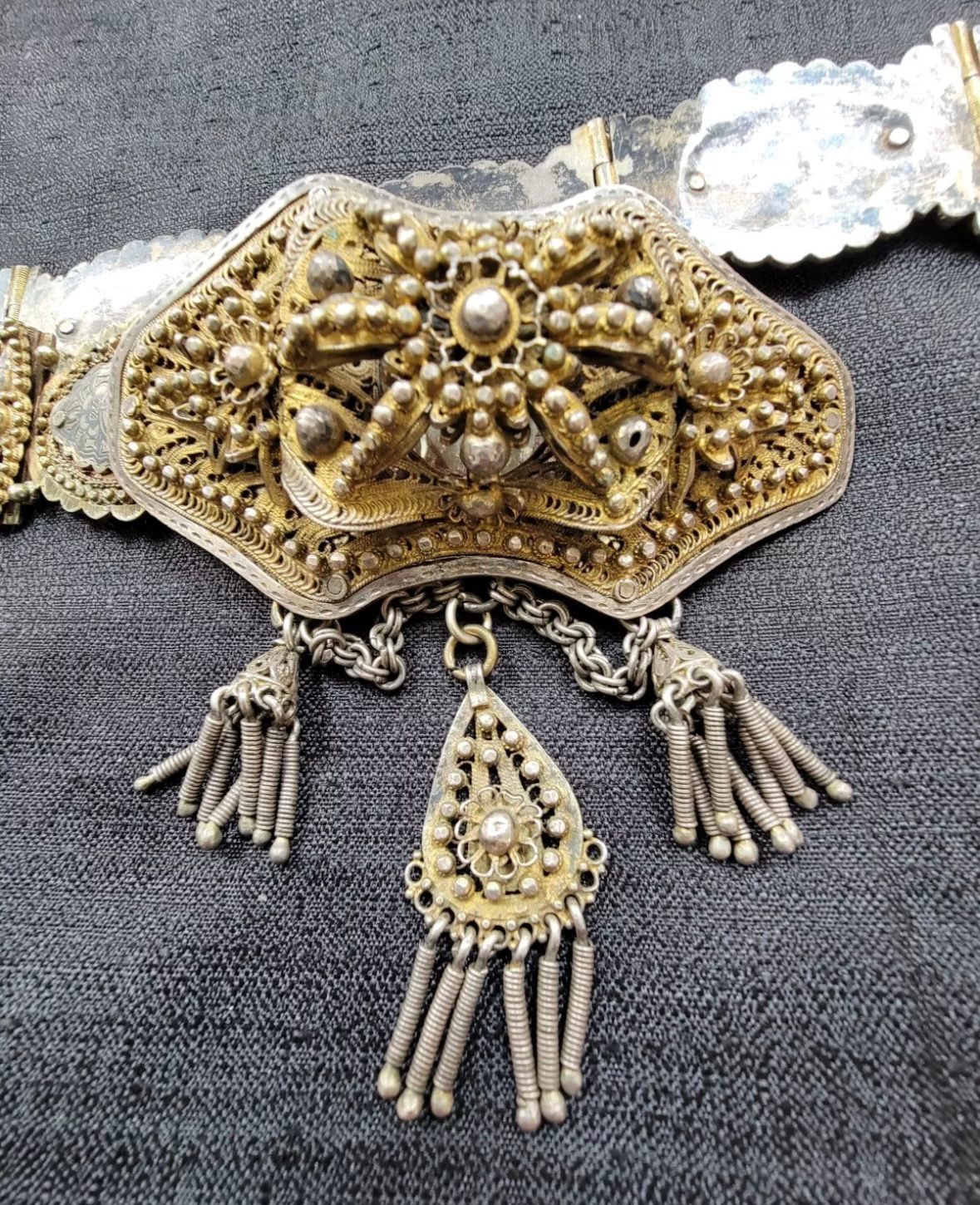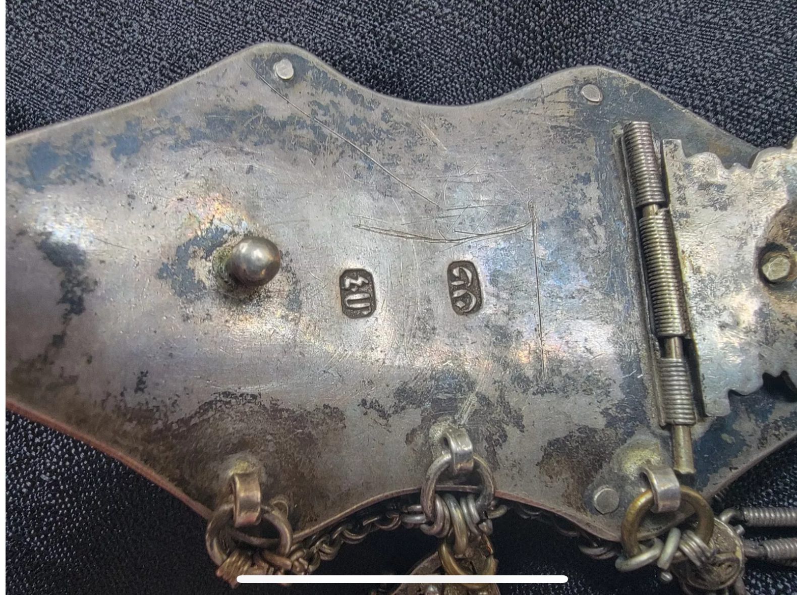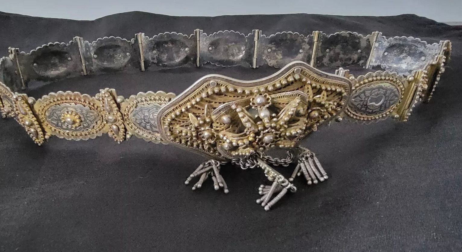This late 19th to early 20th-century Ottoman belt features 15 gilt silver panels adorned with niello enamel floral designs. The niello technique, which involves filling engraved lines with a black alloy, creates a striking contrast with the gilded silver. Originating from Armenian metal craftsmen from Van, the belt is crafted from gilded silver and features a detailed buckle with filigree work and three decorative filigree dangles. Hallmarks are present, indicating its authenticity and potential age. It measures approximately 30 inches in interior circumference, with each of the 15 panels sized at 1.25 by 1.75 inches. The belt is marked with "Van" in Ottoman Turkish script and ՀՄ (HM) in Armenian, the latter being the initials of the metal craftsman.Category