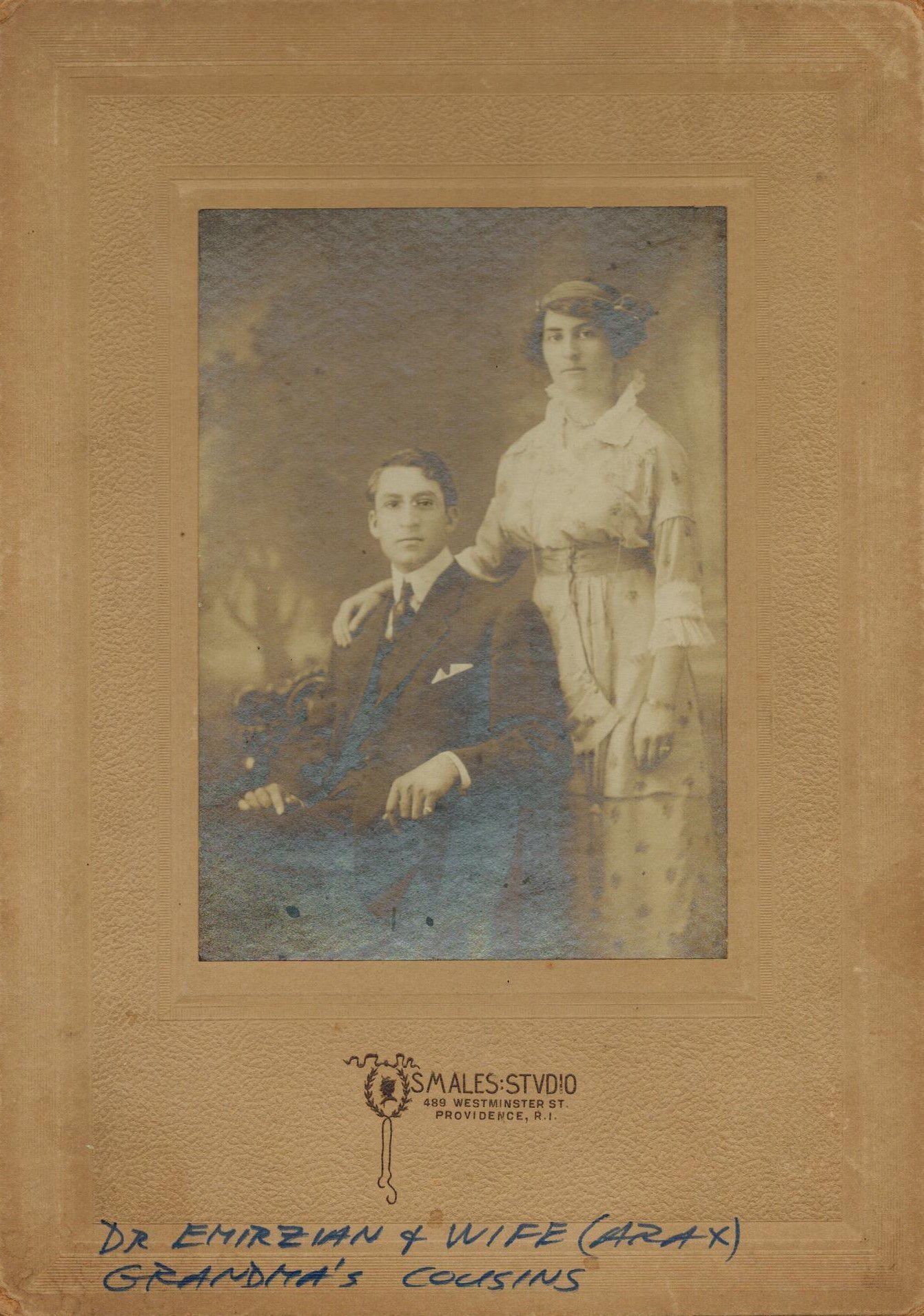 Photograph of Hachadoor and Arax (Shahinian) Emirzian. Arax Shahinian Emirzian was born in Erzinga on April 23, 1896. She immigrated to the United States on November 4, 1912, and married Hachadoor Emirzian in 1914. The couple eventually settled in Providence, Rhode Island. Hachadoor (Harry) Emirzian was born on September 28, 1887, in Kharpert to Sarkis and Anna Emirzian.Photograph Details