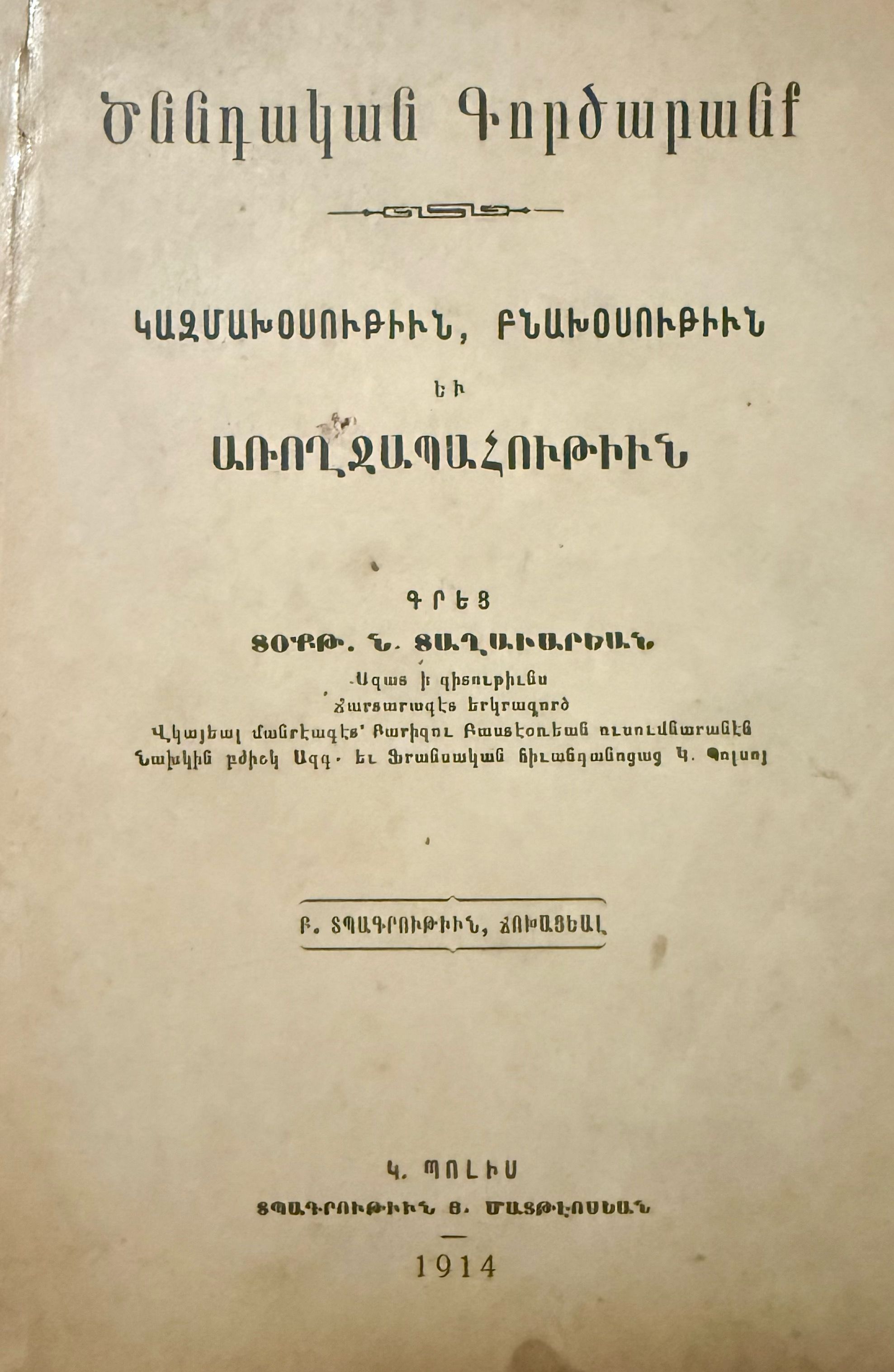 Birth Contract: Anatomy, Physiology, and Hygiene was first published in 1899 and authored by Nazaret Daghavarian, a prominent physician, intellectual, and reformer. This edition appeared just one year before Daghavarian was killed during the Armenian Genocide in 1915. The book presents a detailed examination of anatomy, physiology, and hygiene, reflecting his dedication to advancing public health and education within the Armenian community.Book Details