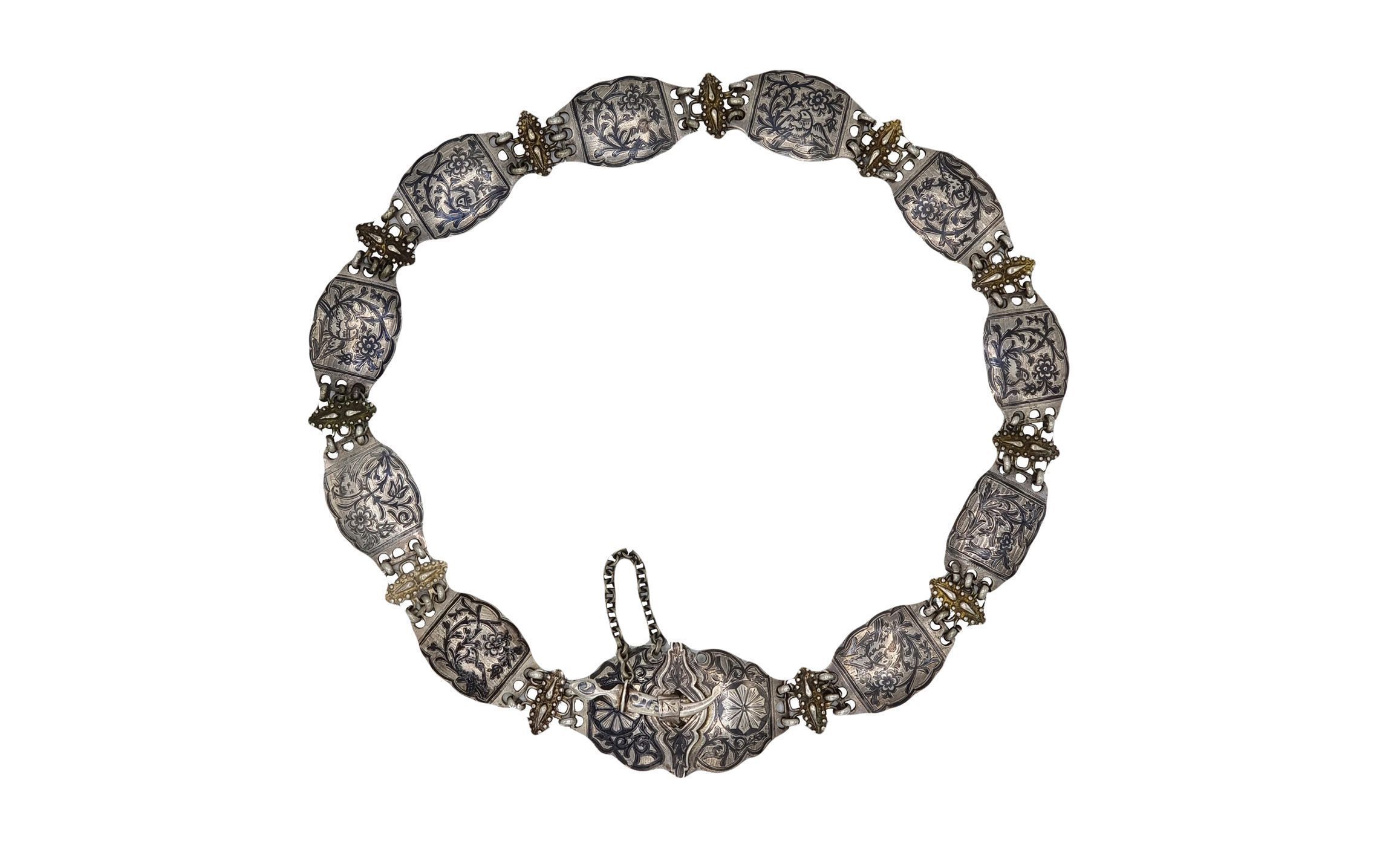 An Armenian silver belt crafted using niello techniques, dating to the late 19th century. On the inner side of the belt's buckle, the Armenian letters "ԱՊ" (likely the initials of the owner's first and last name) are inscribed.