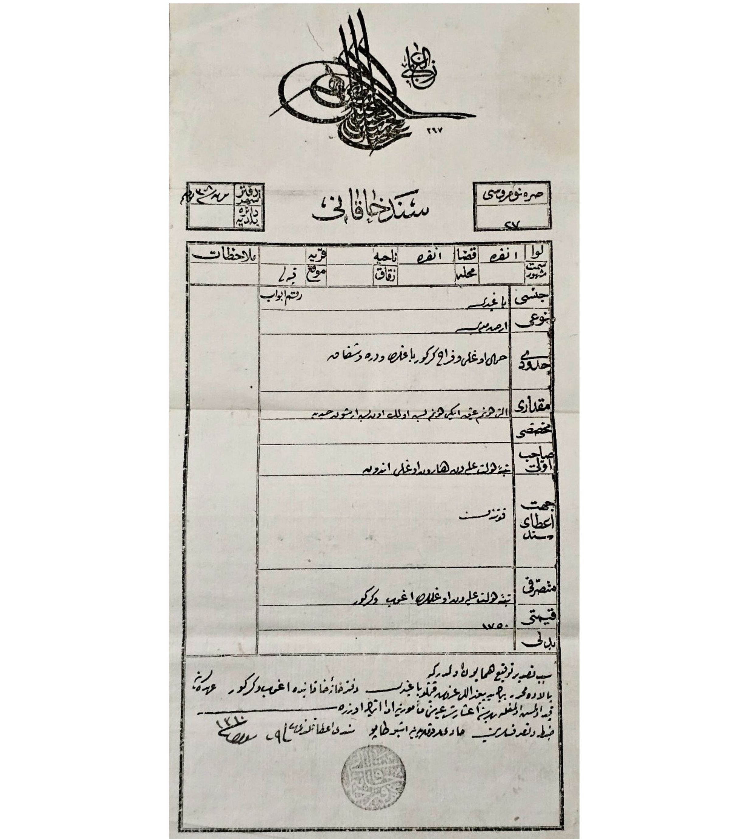 An 1896 Imperial Property Deed (Sened-i Hakani) concerning the transfer of ownership of a vineyard located in the Kayalı district of Ankara to Agop and Kirkor.