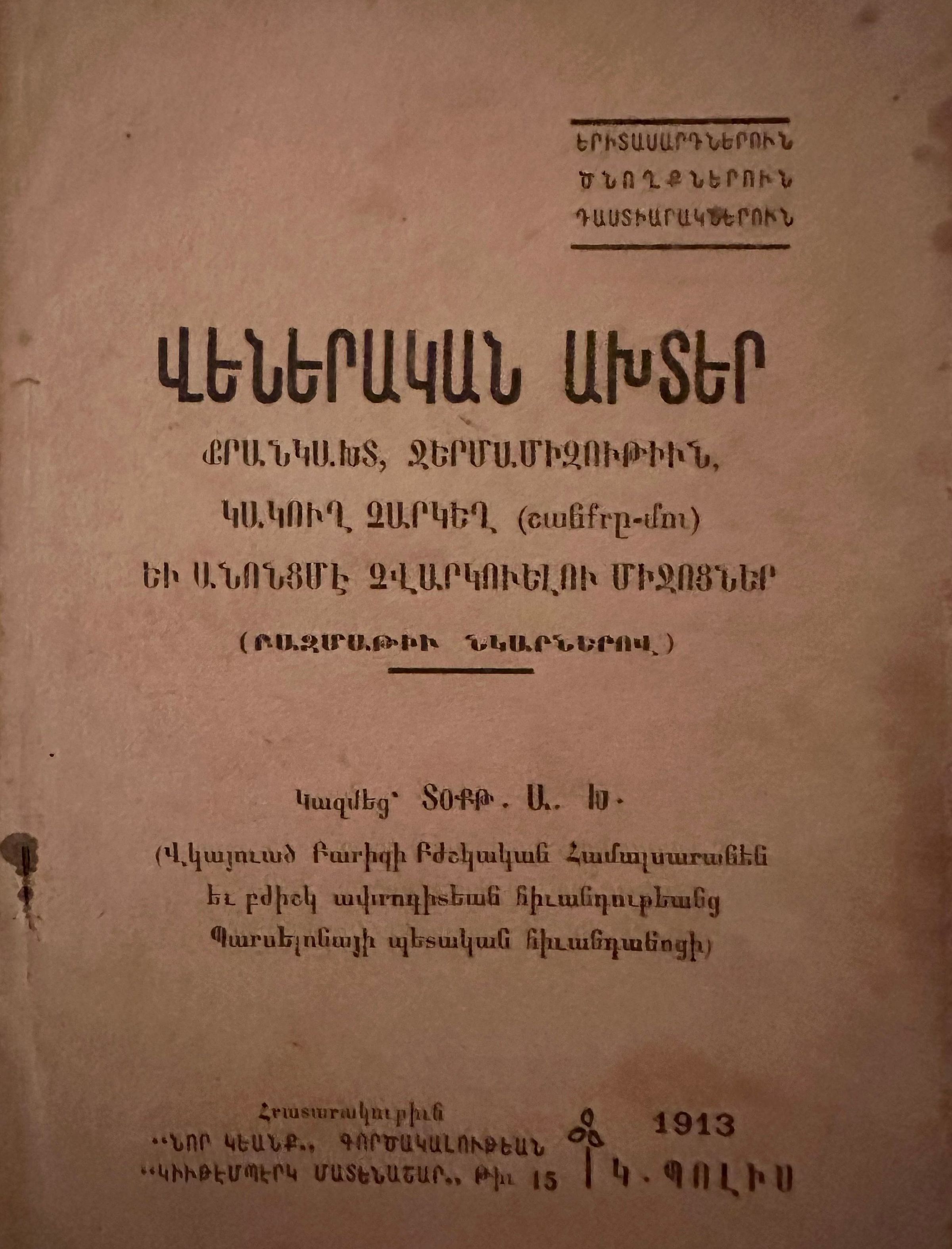 Although syphilis had existed in Ottoman society since the sixteenth century, it became an alarming medical and social phenomenon as a consequence of intensified mobility in the second half of the century, particularly among migrants, soldiers, and seasonal workers traveling to and from the Ottoman countryside. This book published in 1913 was by a doctor who left solely his initials (A. Kh.) on the title page. He studied in Paris and worked in the national hospital in Barcelona.Book Details