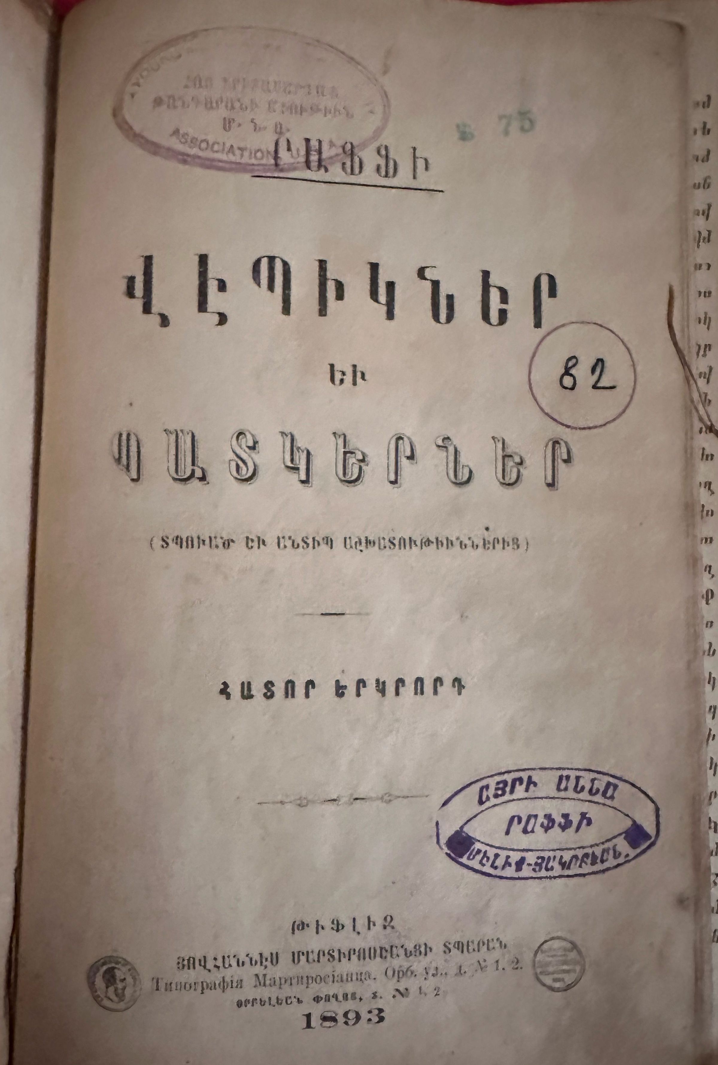 Ink stamp on title page: ԱՅՐԻ ԱՆՆԱ ՐԱՖՖԻ ՄԷԼԻՔ-ՅԱԿՈԲԵԱՆ [Anna Raffi, widow of the author Raffi]Book Details