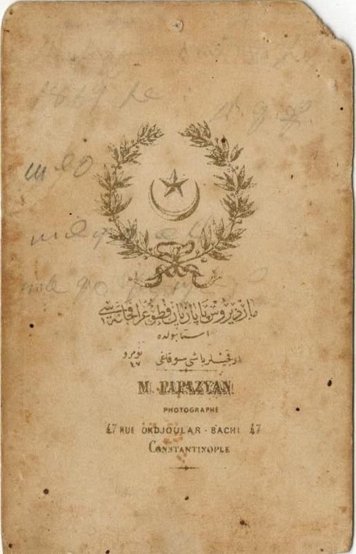 Mateos Papazian began his photographic career with Antoine Zilpochian. They established the Zilpochian-Papazian studio in the early 1860s but parted ways a few years later to pursue separate businesses. The studio was located at 47 Rue Okdjoular-Bachi (later Okçularbaşı) in the Beyazıt district of Constantinople, a street that no longer exists. Later, seals of Papazian's studio on Grand Rue de Galata appeared and make grand claims, boasting various international awards. However, there is no evidence that he ever participated in such competitions. This was likely a deceptive tactic aimed at attracting unsuspecting clients.