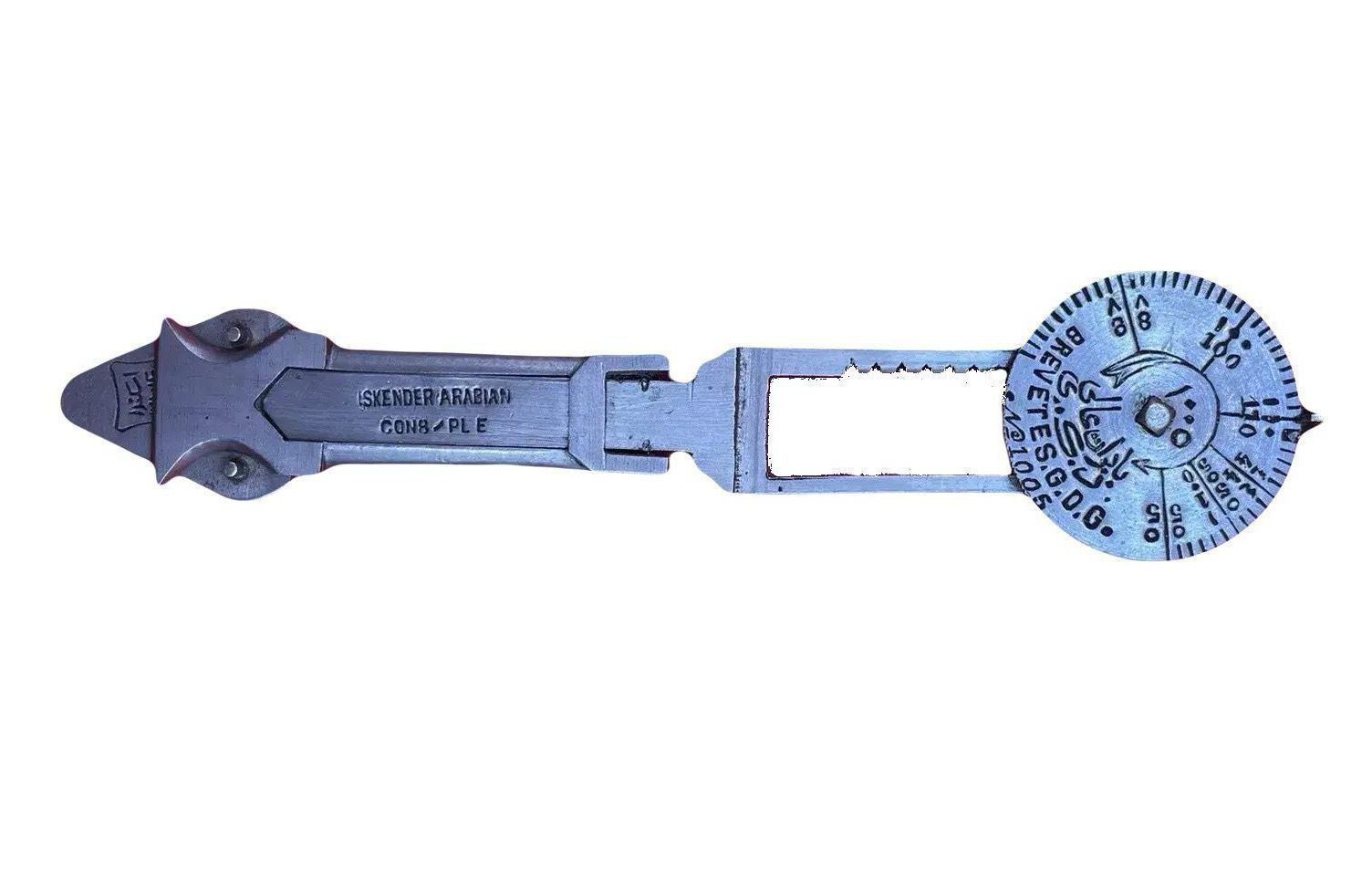 The Antique Iskender Arabian 4-Inch Coin Rocker, produced in Constantinople, features a triangular pan, a folding handle, and a racked dial. The rocker can also be used to weigh gold, jewels, and other precious items. It was also very regularly used against counterfeit materials. This device is marked No. 1005 - Breveté SGDG and includes Eastern, Western, and Arabic numerals. The coin rocker is likely to have developed around 1910 since the first mention of it was made by the 1910 edition of the La Revue Du Monde Arabe. The headquarters was located in Kadikoy at Rıza Paşa.Use