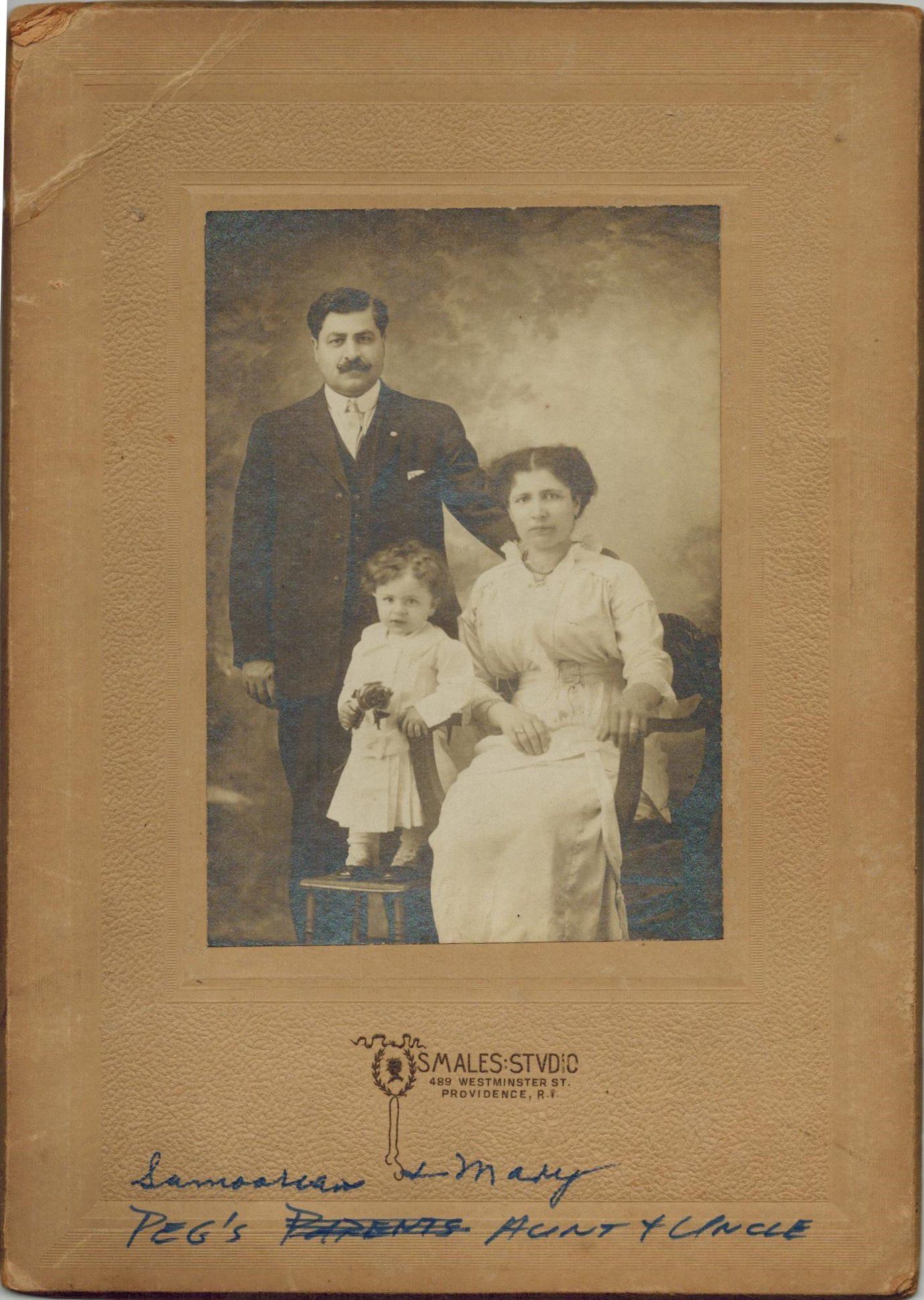 The photograph features Azniv Samoorian, her daughter Mary Samoorian (also known as Mary Vican), and Mary's husband, Harout, who was born on December 17, 1921, in Providence, RI. Azniv, born as Azniv Shahinian in 1887, possibly in Smyrna, immigrated to the United States in 1907, where she married Harout Samoorian, an immigrant from Kharpert.Made/Created